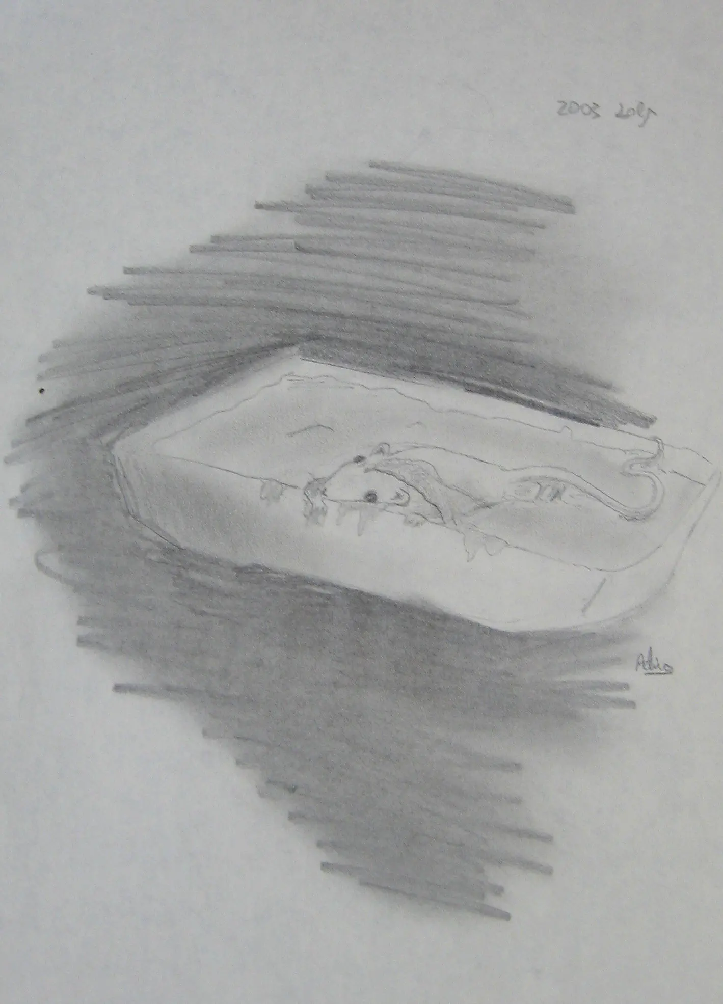 בחסד ה' יתברך אז ככה- צירתי את זה בכיתה ט,בסערת רגשות אחרי שבאולפנא תפסו עכבר במלכודת דבק, וכשניסיתי לשחרר אותו גיליתי שאין דרך לעשות זאת בלי לקרוע את עורו מעליו, ואמרתי להם לפחות להטביע אותו מהר, כי זה צער בעלי חיים מחריד. (הוא היה שם מהבוקר) צוייר רק בעפרון רגיל, לכן אולי לא ניכרת השקעה- והצללים השחורים מסביב פשוט הביעו את מה שהרגשתי. ולסיכום- בבקשה אל תשתמשו במלכודות דבק... אפשר להשתמש במלכודת ברזל עפ פתיון, שנסגרת וכולאת את העכבר בפנים- ואז לשחרר לטבע רחוק מהבית. צער בעלי חיים זה איסור מהתורה!