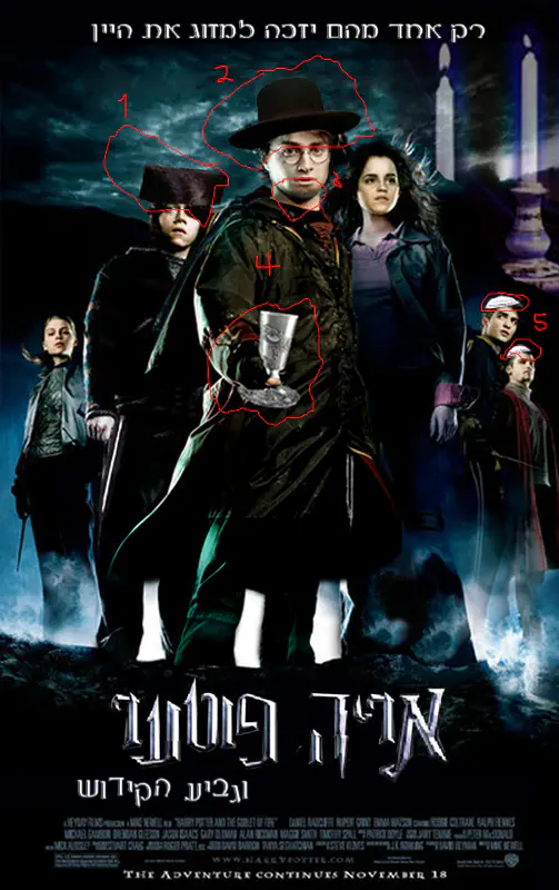 1. הכובע של רון נראה חביב... אבל יש בעיה אם הזווית ולא משתלב אם הצבע וההצללות של הסצנה.. אבל הדבר שהכי הפריעה לי הוא שלא היה שום הצללה על הפרצוף של רון מהכובע. 2.כאן הזווית עוד בסדר... אבל שוב ההצללה של הכובע על הפרצוף מאוד חסרה.. 3. בקשר לזקן... אני אישית לא ראיתי בן אדם הולך אם זקן כזה... (חוץ מ-'איי משים') אבל מה שבאמת הפריעה לי זה שבכל שאר הפרצוף הוא מגולך בצורה מצויינת משהו שמאוד קשה לעשות מתי שיש לך זקן כזה.. 4. הגביע... הרזלוציה שלו לא תואמת לרזלוציה של התמונה המקורית של הארי פוטר.. אבל יש עוד כמה דברים שוליים שהם הצללה והשתקפות שמאוד חסרים.. 5. לכיפות יש את אותה הבעיה שיש לכובעים... אבל גם כיפה לא כזאת צמודה לראש של הבן אדם...