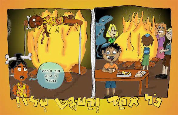 אני היתי עושה קצת אחרת.המדורות באותו גודל.ושיש לשנים שולחן. החלון של האנשים שמדברים באותו גודל.ומה שהם אומרים. טוב ח'ברה מי רוצה פלפל.טוב ח'ברה מי הבא בתור. שבת שלום