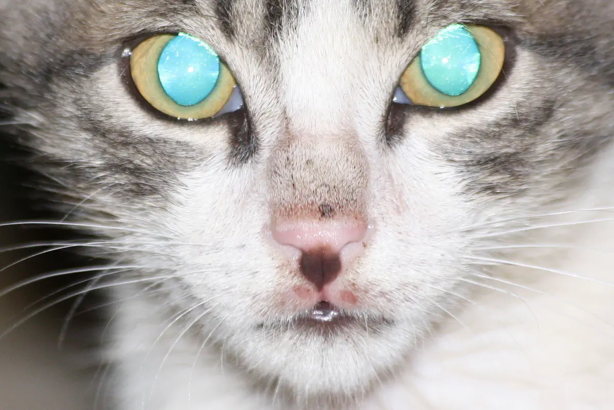 האור הכחול בעניים נוצר ע"י הפלאש (הישיר), אין לי מושג איך ולמה.