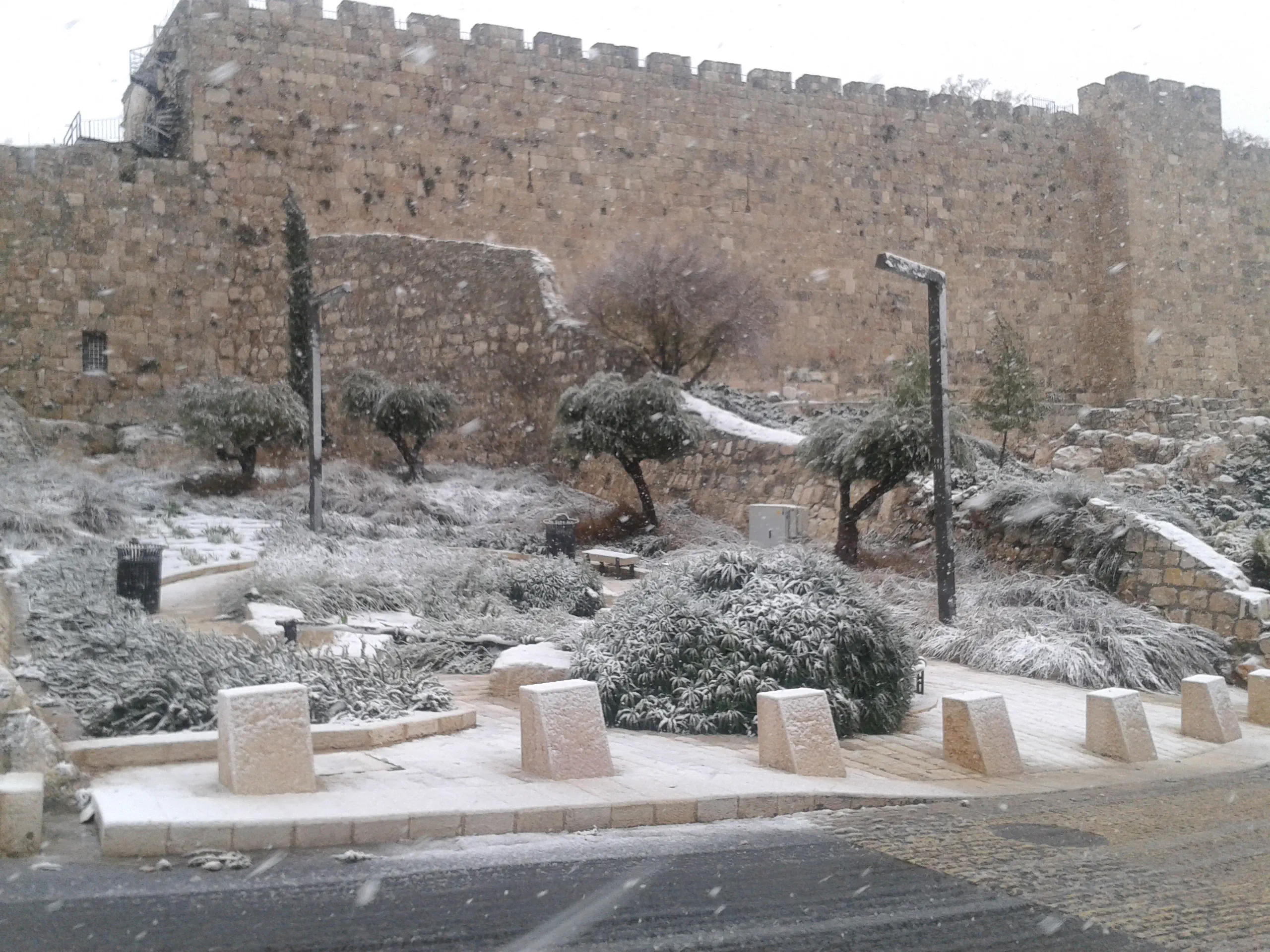 תחת מטרייה בסופת השלגים ליד עץ שנפל במהלך הסופה ליד שער יפו בירושלים,: