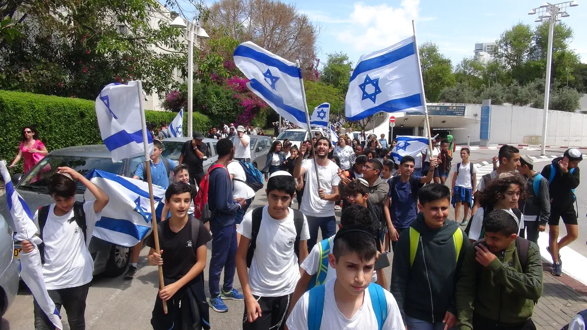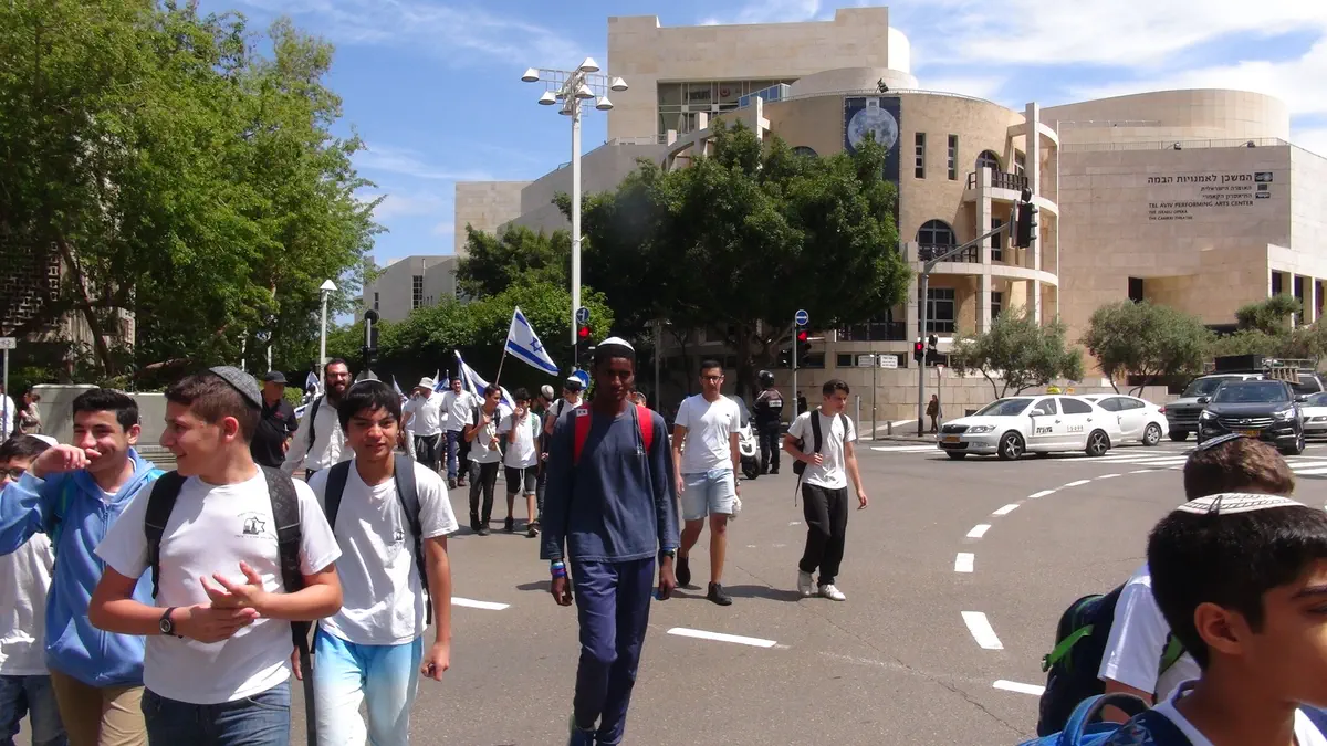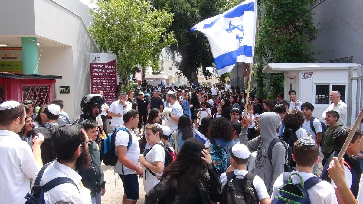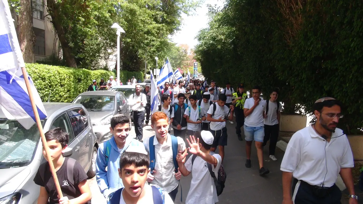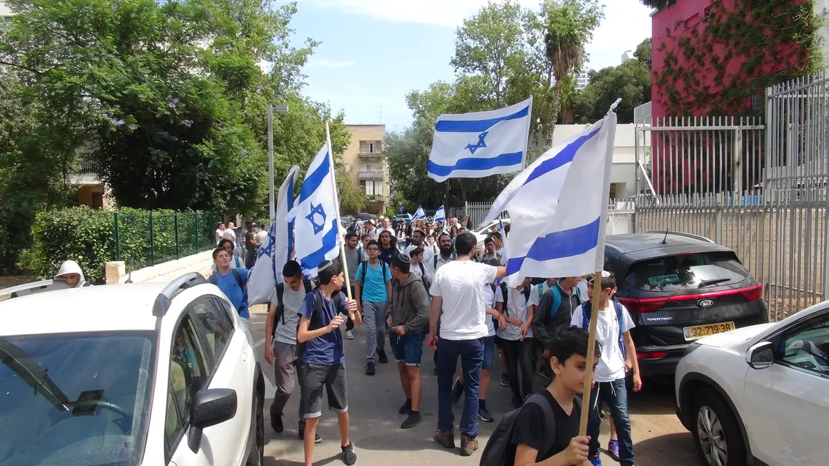 חוגגים "יום ירושלים" גם בלב בתל אביב. תלמידי תיכון עירוני תורני "צייטלין" בתל אביב צעדו הבוקר (ראשון) עם דגלי ישראל ברחובות העיר העברית הראשונה.