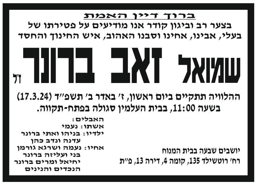 איש החינוך והחסד זאב ברונר הלך לעולמו והוא בן 88.