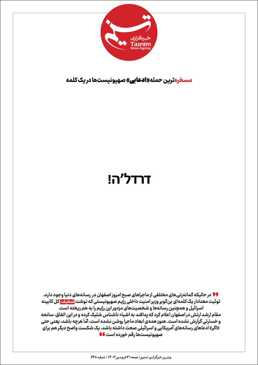 ערוץ 7מבזקיםלעג לישראל: סוכנות הידיעות של משמרות המהפכה מצטטת את "דרדל'ה" של בן גבירלעג לישראל: סוכנות הידיעות של משמרות המהפכה מצטטת את "דרדל'ה" של בן גבירי"א בניסן תשפ"ד 19.04.24, 16:46סוכנות הידיעות תסנים המקושרת עם משמרות המהפכה האסלאמית לועגת לישראל ומשתמשת בתיאור של בן גביר לתקיפה המיוחסת לישראל:מצאתם טעות או פרסומת לא ראויה? דווחו לנו