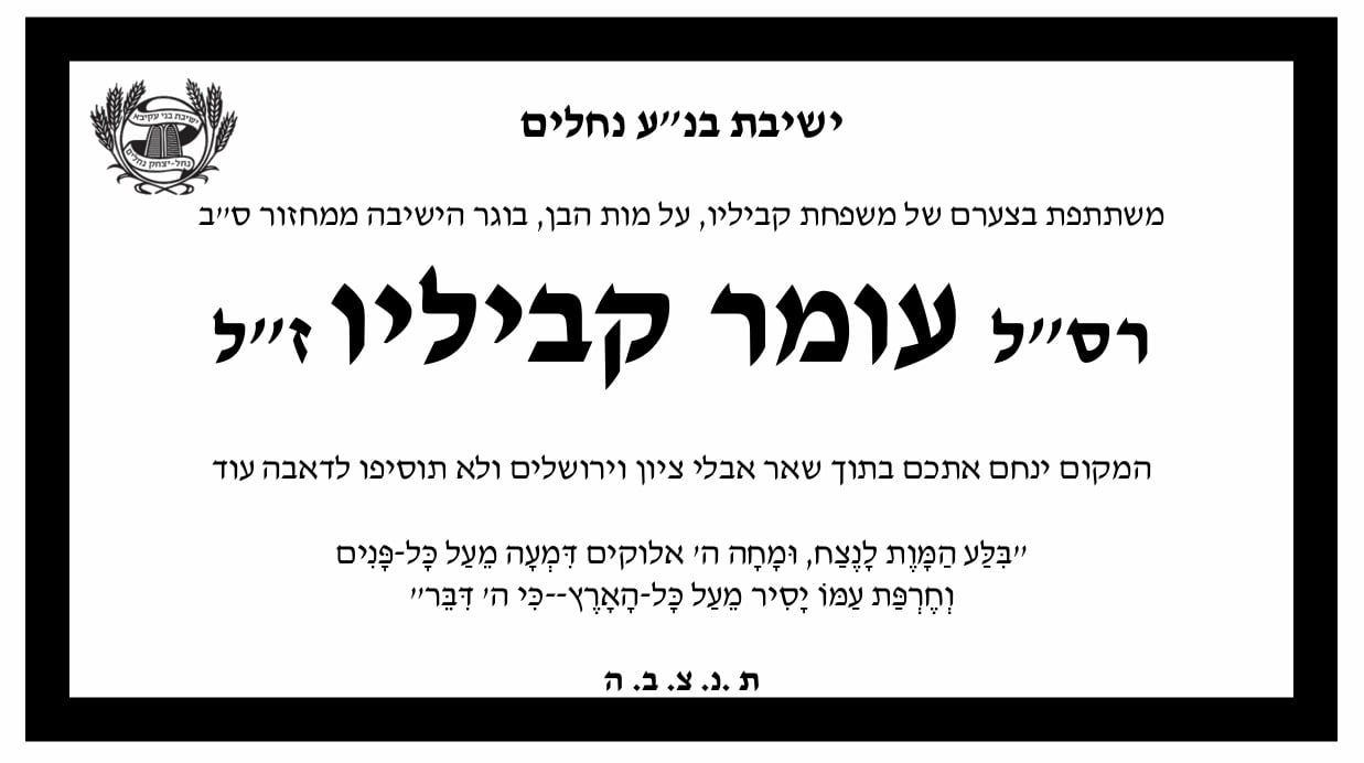 ערוץ 7מבזקיםרב סמל עומר קביליו נהרג בדרך לפעילות מבצעית בצפון, הלווייתו היום ב-16:00 בסגולה פ"תרב סמל עומר קביליו נהרג בדרך לפעילות מבצעית בצפון, הלווייתו היום ב-16:00 בסגולה פ"תי"ב באייר תשפ"ד 20.05.24, 12:17בוגר ישיבת נחלים רב סמל עומר קביליו נהרג בתאונה בדרך לפעילות מבצעית בצפון. הלווייתו היום ב-16:00 בסגולה פתח תקווה.הכתבה במלואהמצאתם טעות או פרסומת לא ראויה? דווחו לנו