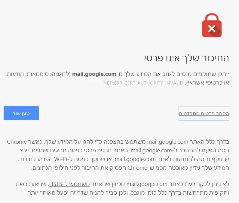 RR_CERT_AUTHORITY_INVALIDייתכן שתוקפים מנסים לגנוב את המידע שלך מ-mail.google.com (לדוגמה: סיסמאות, הודעות או כרטיסי אשראי).