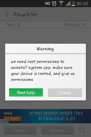 ההודעה הראשונה מתריעה על כך שניסית למחוק אפליקציות שבאות מותקנות יחד עם מערכת ההפעלה. מכיוון שהמכשיר שלך לא עבר רוט, לא תוכלי לעשות זאת.