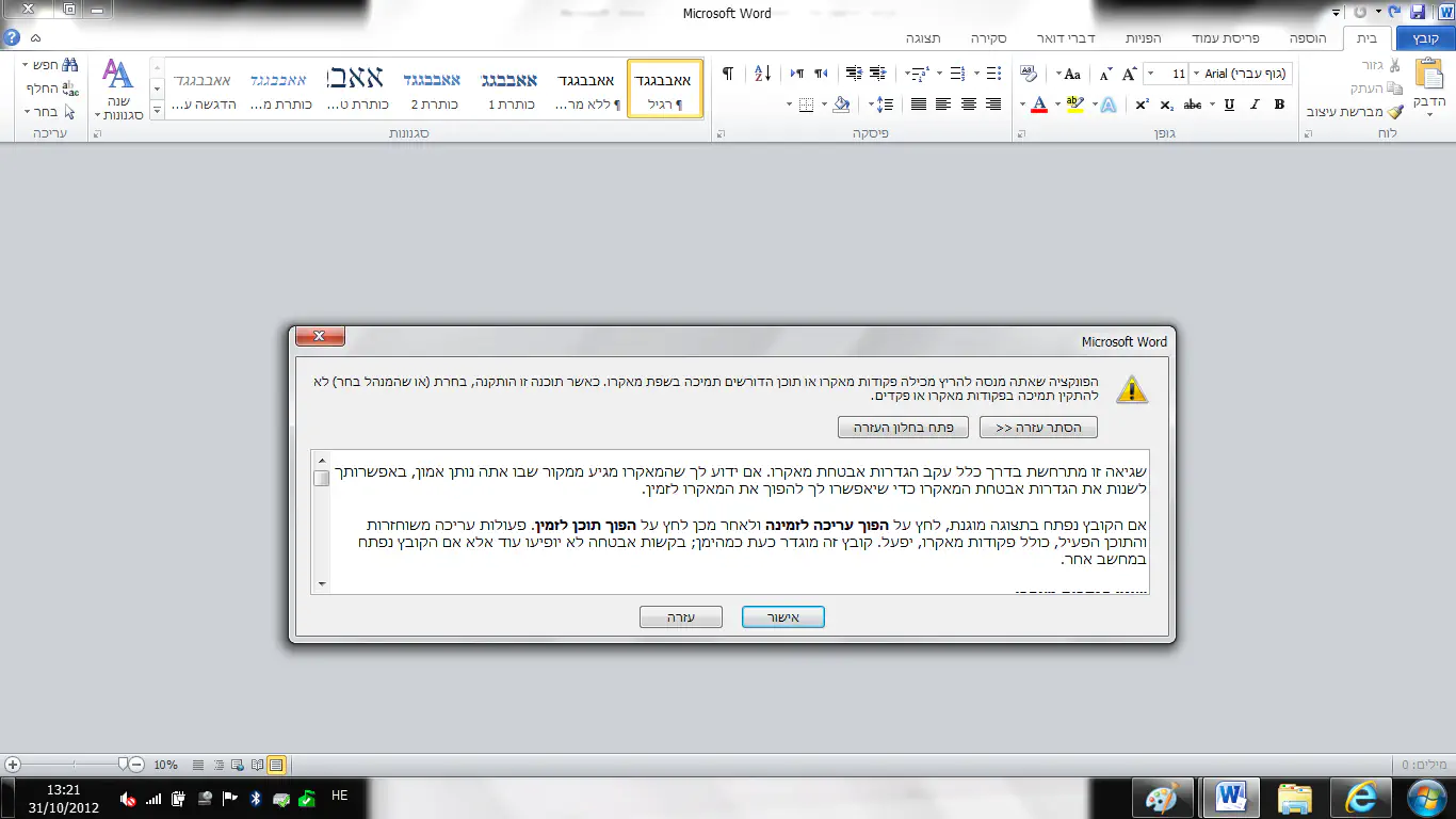עוד חלון מעצבן שנפתח זה כשאני רוצה לצאת מהמסמך. אחרי שלחצתי כבר שמור, החלון הזה נפתח ונסגר רק עם "אל תשמור" (מלחיץ! אבל החומר נשמר כמו שצריך לפני)