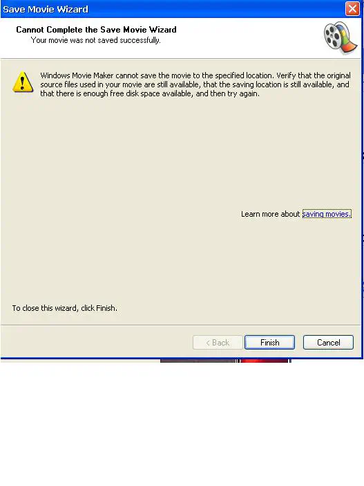 אתה צריך לבדוק שכל התמונות/הסרטונים ששמת בקובץ נשארו במקום שבו הם היו כששמת אותם [ז"א- שאין לך X גדול אדום במקום תמונה איפושהו], שהמיקום שבו אתה רוצה לשמור את הסרט עדיין זמין ושיש לו מספיק מקום זמין בשביל הסרט.