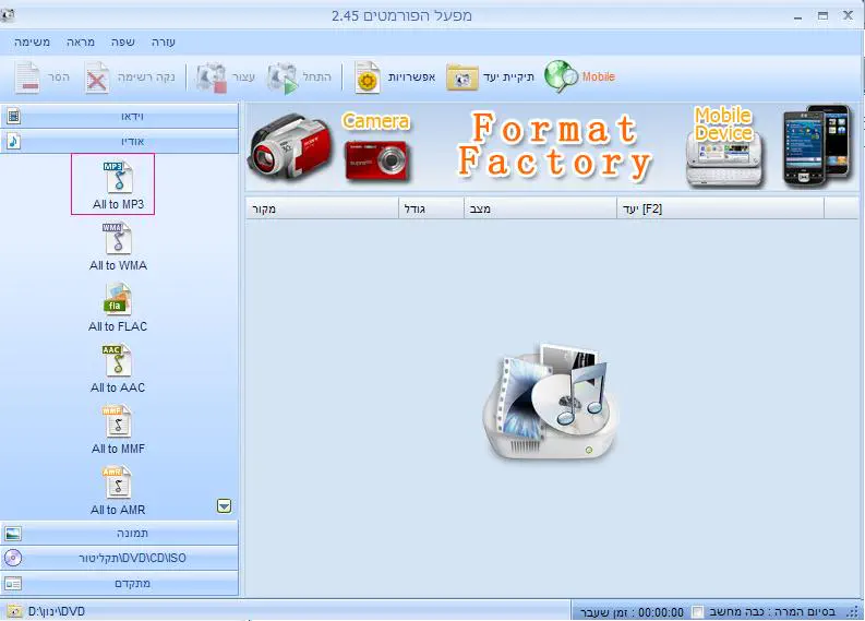 את צריכה לבחור את הפורמט הרצוי, לייבא את הקובץ המיועד להמרה, וללחוץ על Start.