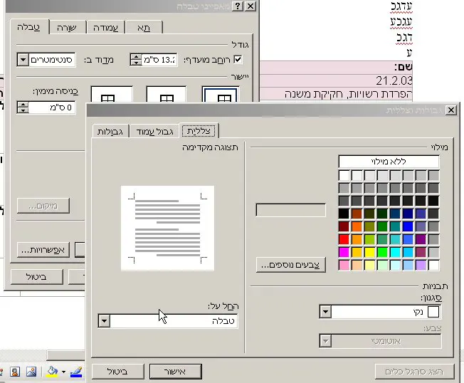 3. בחלון שנפתח: לחצי על הלשונית טבלה, אח"כ לחצי על גבולות וצללית.