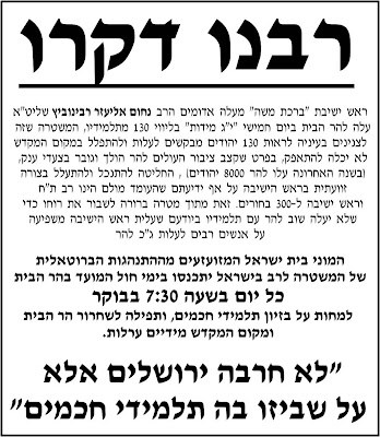 פגיעה חמורה במרן ראש הישיבה הרב נחום אליעזר רבינוביץ שליט"א / מרן ראש הישיבה הגיע ביום חמישי "י"ג מידות" להר הבית והתקבל ביחס משפיל ביותר ע"י משטרת ישראל / רבינו דקרובחול המועד סוכות נעלה למקום המקדש למחות על ביזוי זקן ראשי ישיבות ההסדר הרב נחום אליעזר רבינוביץ שליט"א ע"י משטרת הר הבית לעיני 120 מתלמידי ישיבת "ברכת משה" מעלה אדומים.