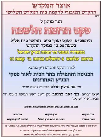 טקס תרומת הלשכה המסורתית שמתקיים ביוזמת "אוצר המקדש" - ההקדש הציבורי להקמת בית המקדש השלישי ובשיתוף כל תנועות המקדש תתקיים כרגיל ביום חמישי כ"ח אלול בשעה 13:00 במוקד ההקדש ברח' עליאש 8 ירושלים הציבור מוזמן לבוא ולתרום "תרומת הלשכה".