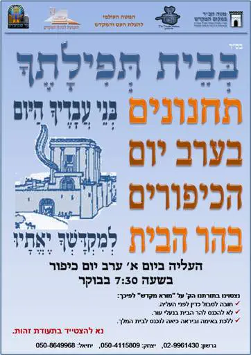 בערב יום הגדול שבו כהן גדול נכנס פעם אחת בשנה ל- "קודש הקדשים" נעלה להר הבית להעתיר ולהתחנן לה' "אנא ה' חטאתי עוויתי פשעתי", נבקש על הכלל ועל הפרט בערב היום הגדול והמסוגל ביותר, יום שבו נחתם על כל מה שיהיה בשנה הזאת, "לחיים ולא למוות לברכה ולא לקללה"