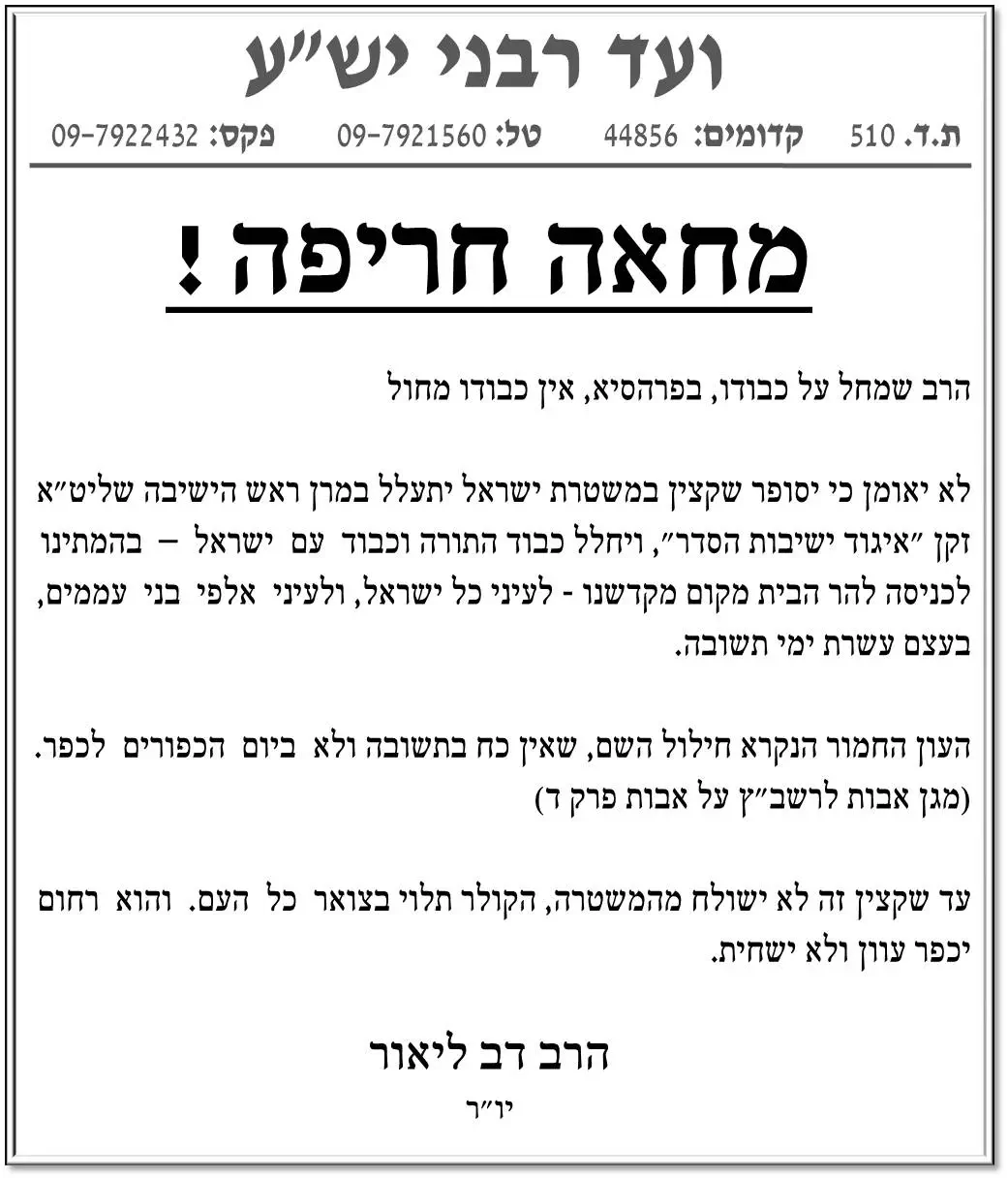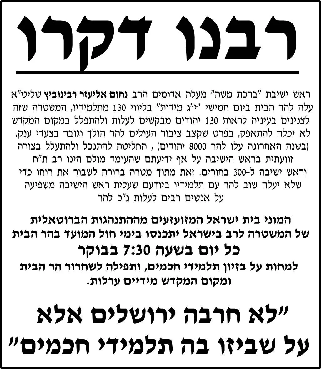 פגיעה חמורה במרן ראש הישיבה הרב נחום אליעזר רבינוביץ שליט"א / מרן ראש הישיבה הגיע ביום חמישי "י"ג מידות" להר הבית והתקבל ביחס משפיל ביותר ע"י משטרת ישראל / רבינו דקרובחול המועד סוכות נעלה למקום המקדש למחות על ביזוי זקן ראשי ישיבות ההסדר הרב נחום אליעזר רבינוביץ שליט"א ע"י משטרת הר הבית לעיני 120 מתלמידי ישיבת "ברכת משה" מעלה אדומים.