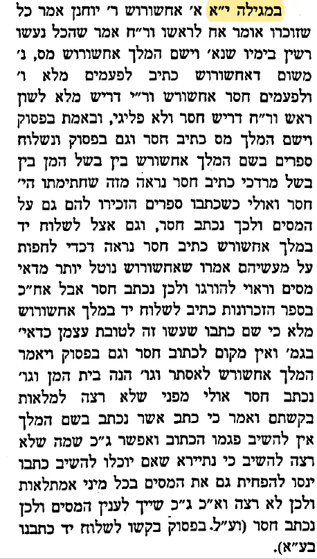 מו"ר הגר"ח קנייבסקי זצ"ל (שהיום יום פקודתו) בביאורו על המגילה (בס' טעמא דקרא) מבאר שכל מקום שנכתב אחשורוש חסר וא"ו מורה ע"ד ר"ח בגמרא שבכל נעשו רשים בימיו, ומבאר כל מקום שנכתב כך, חסר, על עניין המיסים. ונראה שדבר עמוק טמון פה, ויבואר אחר תוספת דגש על עניין אחר, שכך כת' בפרק ב' (פס' יח):