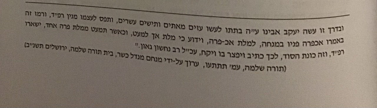 ספר בראשית, גם יעקב אבינו משתמש באותה לשון ״ואמרתם גם הנה עבדך יעקב אחרינו כי-אמר אכפרה פניו במנחה ההלכת לפני״.(בראשית פרק לב פס׳ כ) (אלה שני המופעים היחידים של מילה זאת בתורה!).