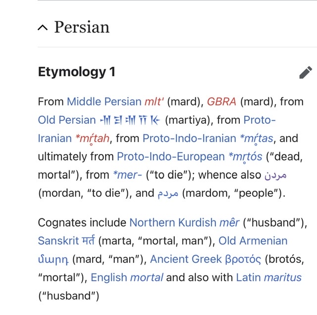 בפרסית המילה לגבר مرد והמילה למת مرده קרובות מאוד ונגזרו משורש קדום (שמשותף גם ל- mortal האנגלי) שהמשמעות שלו היא מת, בן תמותה.