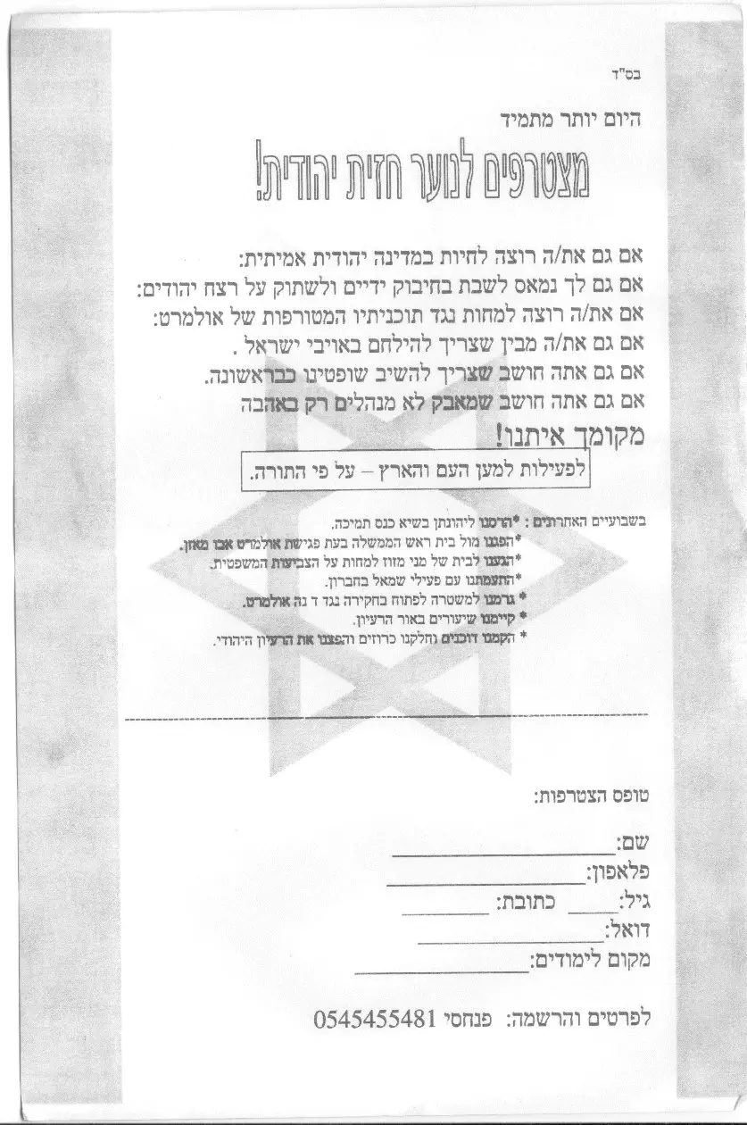 אם גם את\ה רוצה לחיות במדינה יהודית אמיתית:אם גם לך נמאס לשבת בחיבוק ידיים ולשתוק על רצח יהודים: אם את\ה רוצה למחות נגד תוכניותיו המטורפות של אולמרט: אם גם את\ה מבין שצריך להילחם באויהי ישראל. אם גם את\ה חושב שצריך להשיב שופטינו כבראשונה. אם גם את\ה חושב שמאבק לא מנהלים רק באהבה.-מקומך איתנו! לפעילות למען התורה והארץ-על פי התורה. לפרטים והרשמה-0545455481