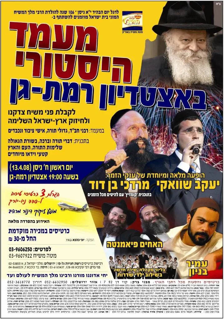 בעוד פחות משבוע, יתקיים אירוע היסטורי לרגל י"א ניסן, יום הולדתו של הרבי מלך המשיח. לאור השתתפות השיא בשנה שעברה כאשר 20 אלף איש גדשו את אצטדיון בלומפילד, ואלפים רבים נותרו בחוץ, יערך השנה האירוע באצטדיון רמת גן, האצטדיון הגדול בישראל בהשתתפות חמישים אלף איש. את האירוע האדיר יכבדו רבנים, אישי ציבור ונכבדים, וינעימו בשירתם ענקי הזמר החסידי מרדכי בן-דוד, יעקב שוואקי, עמיר בניון, לצד האחים פיאמנטה ובליווי מקהלת 'שירה חדשה'.
