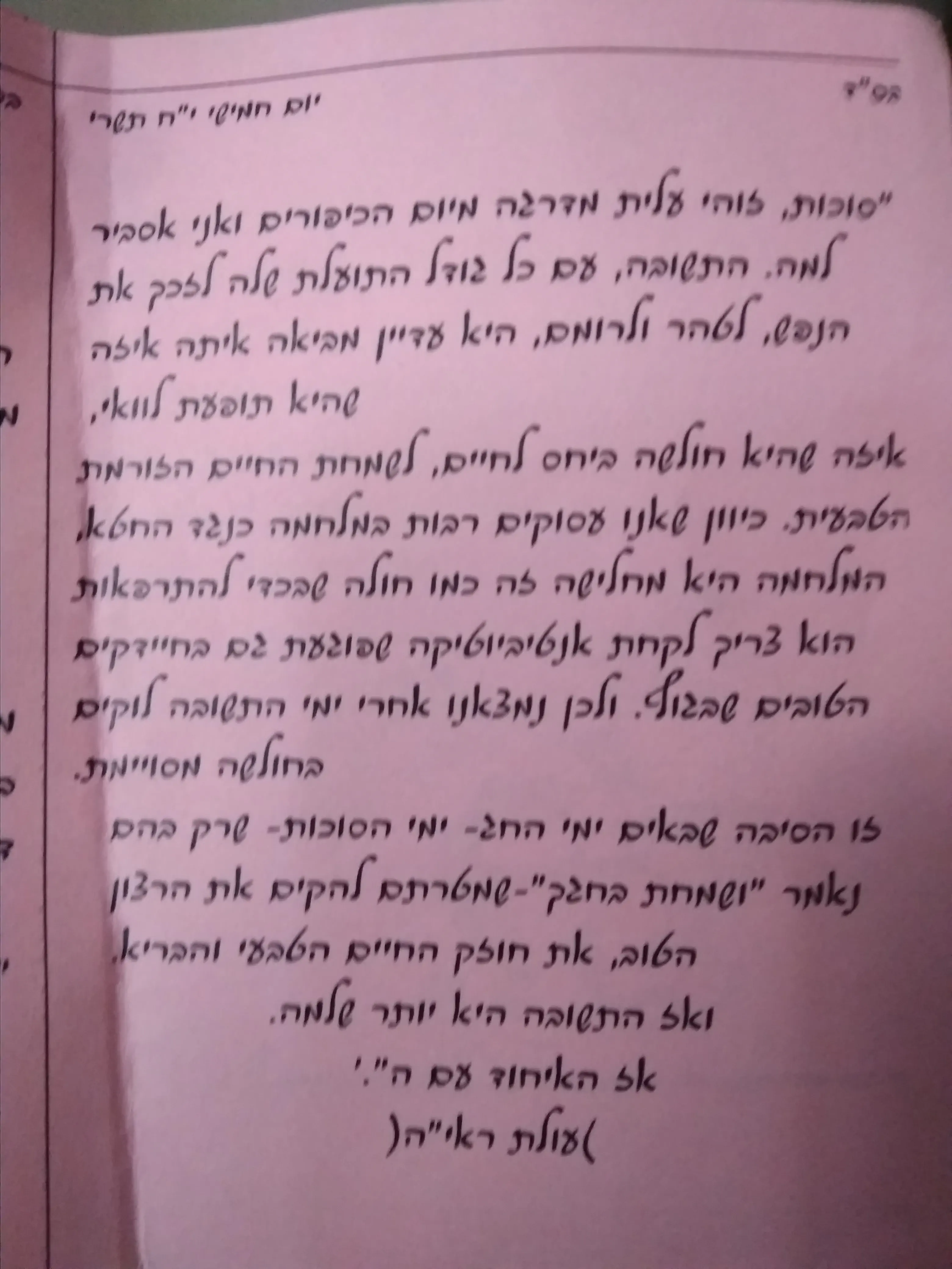 וזה מעורר מחשבות על הארעיות ועל הביטחון, על ההבנה שנכנסו לבית מרפא למשך שבוע, בית מרפא שעניינו הוא לחבר אותנו לחיים האמיתיים, לא אלה הפיזיים שנגמרים ב120 שנה, אלא לחיי הנשמה. זאת שהיא נצחית, זאת שהיא מורכבת מכל חלקי עם ישראל, זו שבלי ארץ ישראל משהו בה חסר בצורה קריטית.