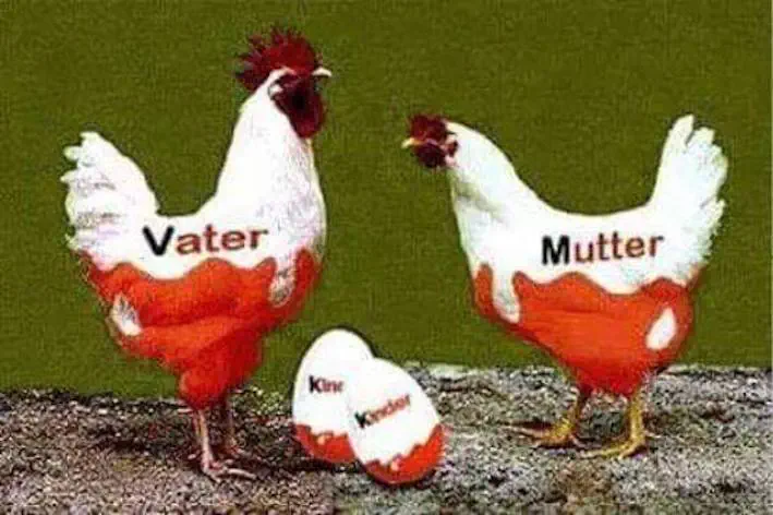 אז עשו לביצי קינדר תרנגול וואטער ותרנגולת מאטער (ילדים, אבא ואמא בגרמנית).