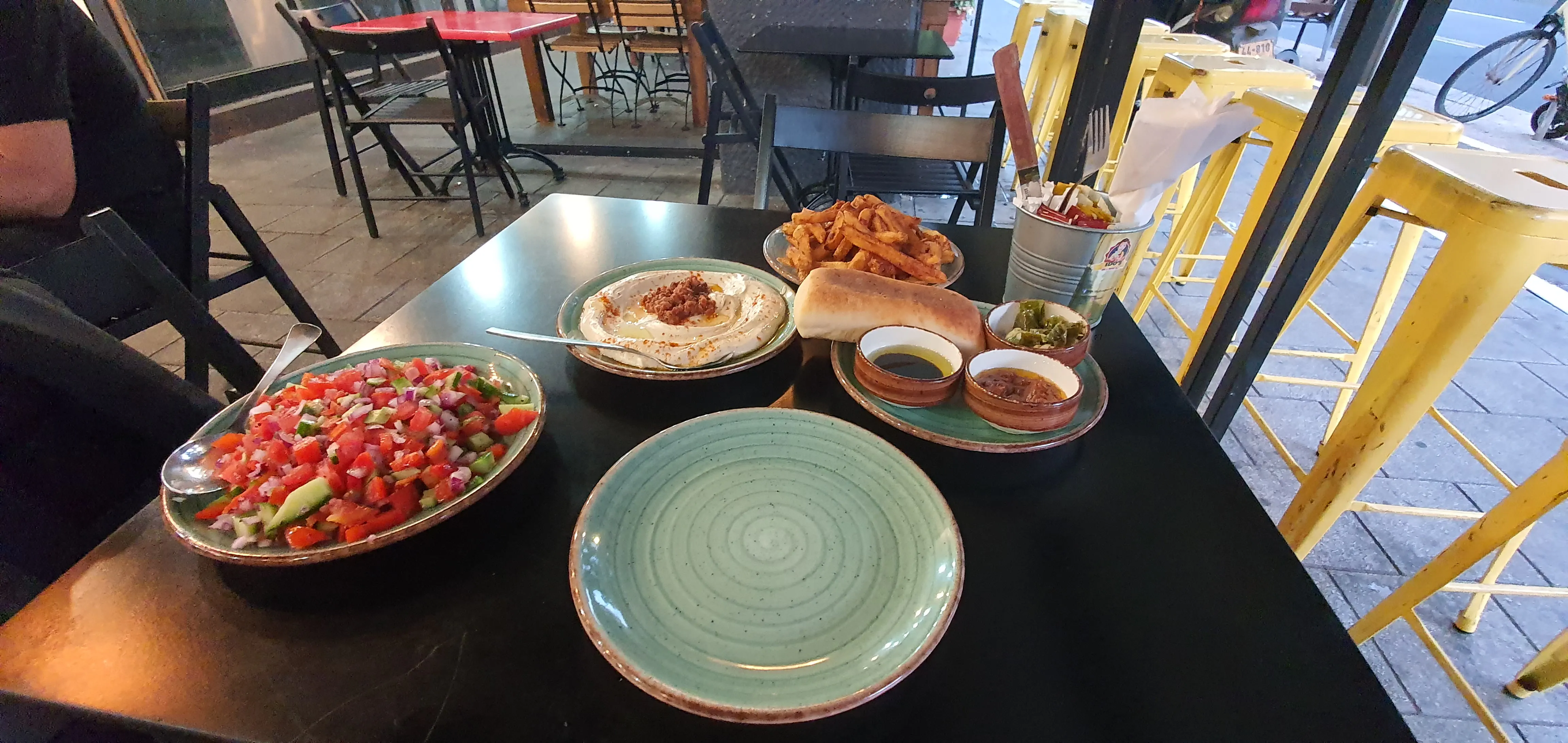 הפרנה הגיע עם 3 מטבלים שונים, מטבוחה, שמן זית,