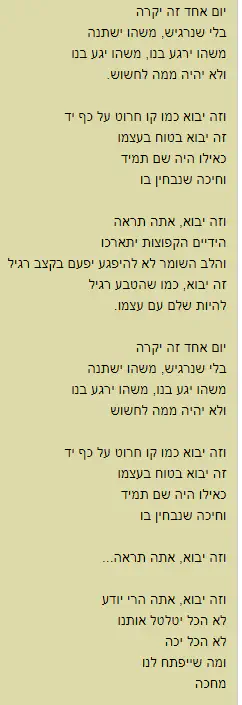 מספיק לי ש"הלב שלי נקרע לשניים מה שלא ראתה שפחה על המים כמו סופה מן הים עולה כמו תופהּ של מרים פועה ואין תרופה בעולם ללב