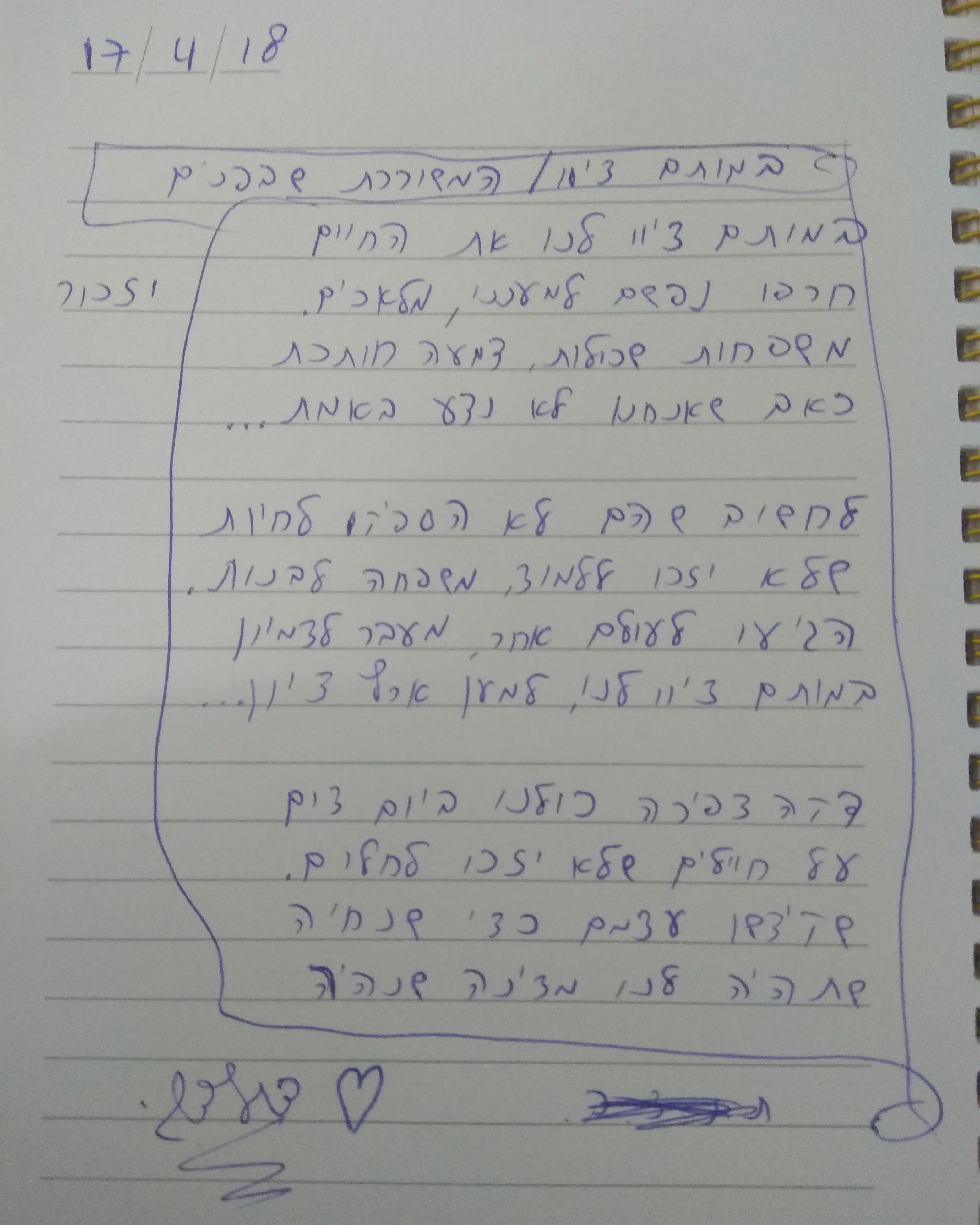 ציוו לנו - חיו! אל תעצרו את חייכם יותר מהנדרש. מותר לבכות, להתגעגע. אבל אח"כ לקום ולעשות.