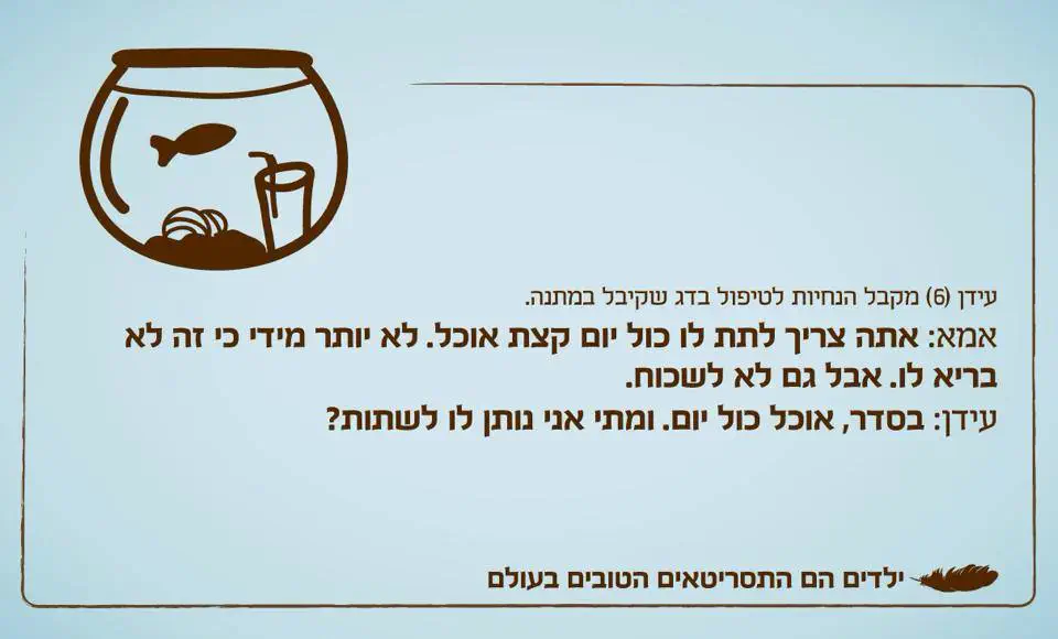 לי פעם לא היה אוכל לדג אז הבאתי לו ביסקוויטים ואחרי שבוע הוא מת