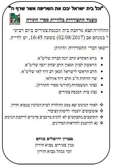 היום בשעה 16:45 הלוויה לספרי תורה במבוא חורוןישתבח שמו!