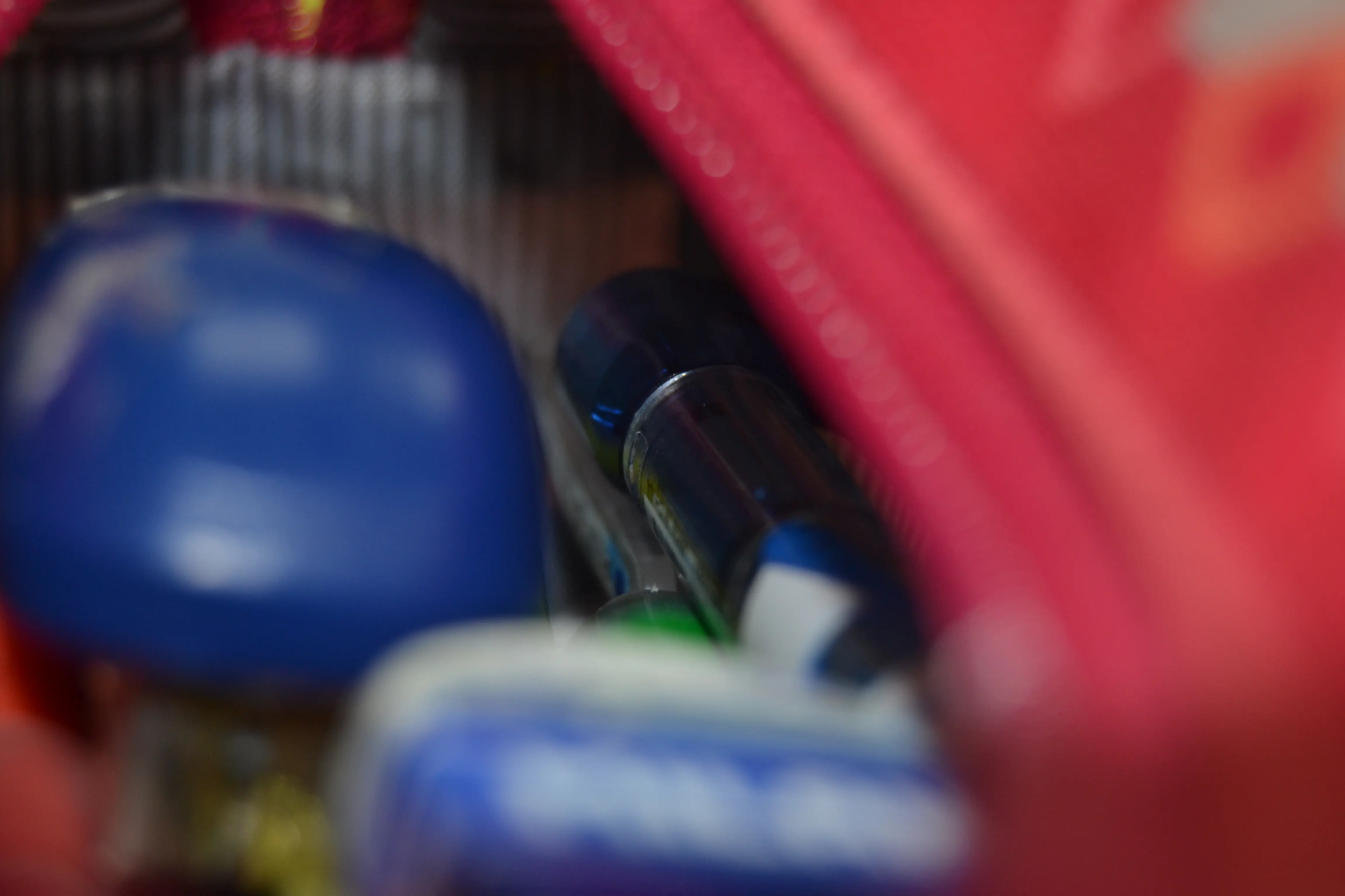 האדום זה קלמר, הכחול שחשבת שזו גזיה זה מהדק (המקדימה שלו), מה שממש הכי קרוב וממש מטושטש זו קופסת סיכות המהדק, מה שנראה כמוו מבחנה זה עיפרון חודים..