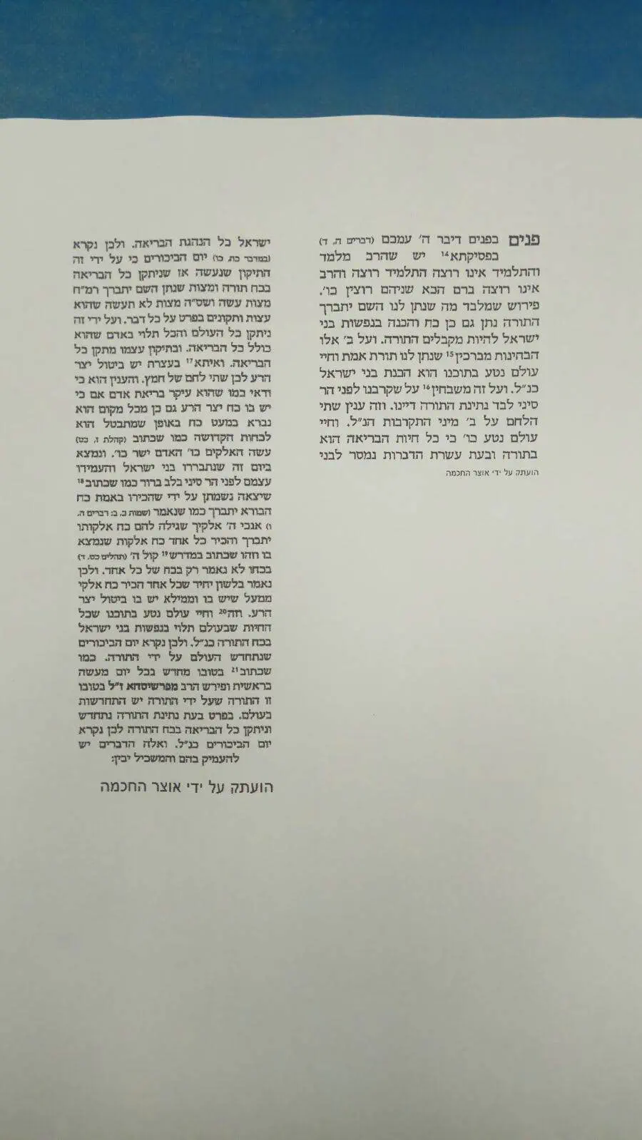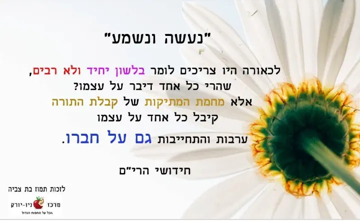הקדמת נעשה לנשמע זהו כחן של ישראל מאז ומעולם. מפני שאנו חשים בקרבנו שבמעמקי הטבע של כל מהותנו, כל קדושת היהדות צפונה. ואם אנו חשים איזו חלישות בגבורתה בנוגע לנפשנו, אנחנו צריכים ראשית לכל להתעורר להיות נאמנים לעצמנו. ננער את עצמנו מכל התכחשות עצמית ונדע להגן בגאון על הצביון השלם שלנו. ואז נצעוד בעוז על דרכנו בכל מסילות החיים ובכללם גם כן בדרכה של התחיה הלאומית ובנין הארץ. כל דבר החקוק בטבע אינו צריך לשמיעה וללמוד. הדבורה בונה את תאי כוורתה בדיוק המספרי היותר שלם, בלי שמיעה של שעורים בהנדסה, מפני שכך חקוק בטבעה. ובעולם הרוחני אין היצורים הרוחניים העליונים צריכים שמיעה לפני מפעליהם, מפני שקדושתם היא להם טבעית. רק בני אדם העלולים להיות נבוכים על ידי מהומות המדע המזויף, צריכים התאמצות לשוב אל הטבע הטהור הנפשי שלהם. ואנחנו במעמד הר סיני, בעת אשר ראש הפסגה של אמיתת הויתנו נתגלה על כללנו, בעת אשר אדון כל נגלה עלינו בערפלי טוהר ללמד לעמנו תורה ומצוות, באנו לידי המעלה העליונה הזאת, ונהיינו ישראלים טבעיים טהורים, כטבע האיתן של נשמתנו בעצם טהרה. ובשביל כך הקדמנו נעשה לנשמע, למעלה מכל התרבות המזויפת של האנושיות השוגה בהבליה והסובלת מסכלות רשעתה בשליטת האדם לרע לו, ואובדת בזה את עצמה ועצמה. ועתה אחים כולכם צעירים וזקנים, בתעופה אמיצה נשוב לאותו הטוהר הנשגב שלנו. ונאמנים לעצם טבע נשמתנו, נעמוד כולנו לבצר את שבות שבותנו בארץ חיינו, על פי היסוד של הטוהר והאמון העצמי. נגלה בכל מפעלי החיים הכלליים והפרטיים את אותו הרז הכמוס מכל האנושיות כולה, המתענה ביסורי כחשותה לעצמה. ובת קול תפוצץ ממרומי הקודש עוד הפעם: "מי גילה רז זה לבני? רז שמלאכי השרת משתמשים בו! וכימי עולם נענה כולנו קול אחד חוצב להבות אש: "כל אשר דבר ה' נעשה ונשמע"