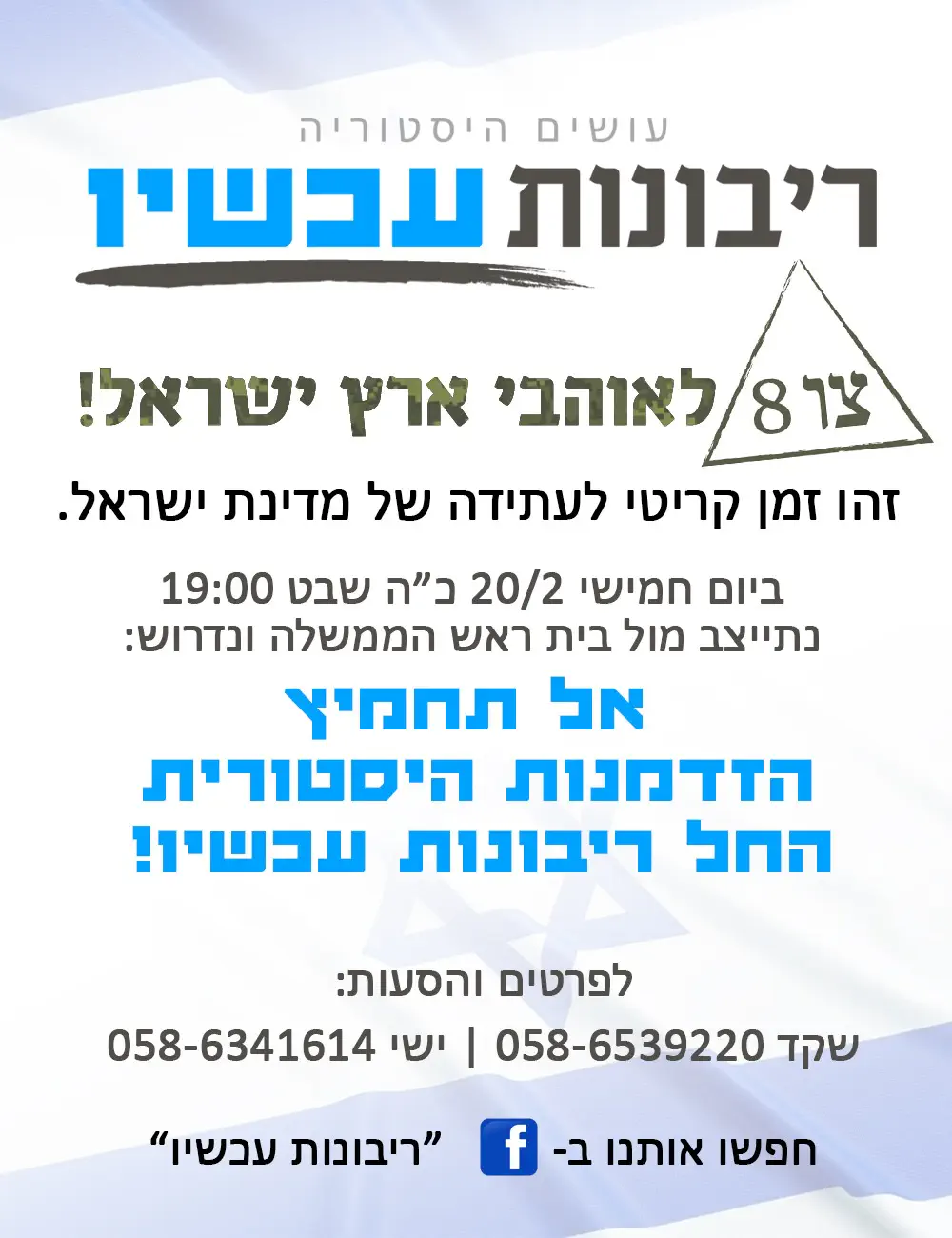 יש גם הסעות מכל הארץ: הרשמה להסעות- עצרת ריבונות עכשיו - 20/02 (קישור להרשמה לעצרת ולהסעות)