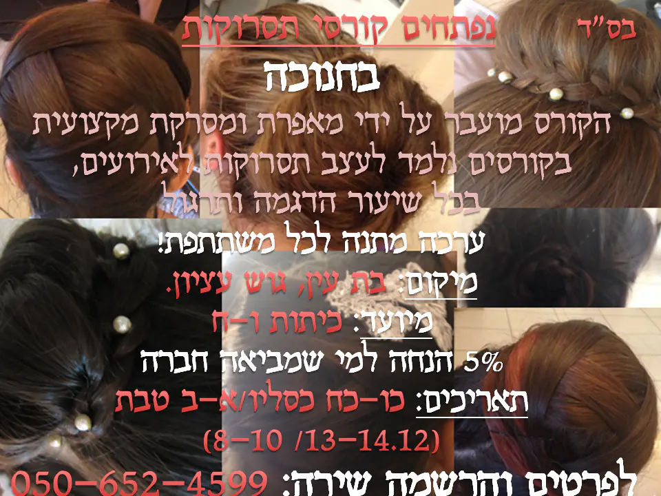מעבירה גם סדנא לנערות בחנוכה בה אלמד כיצד לעשות תסרוקות לאירועים.(ניתן ליצור איתי קשר במייל)