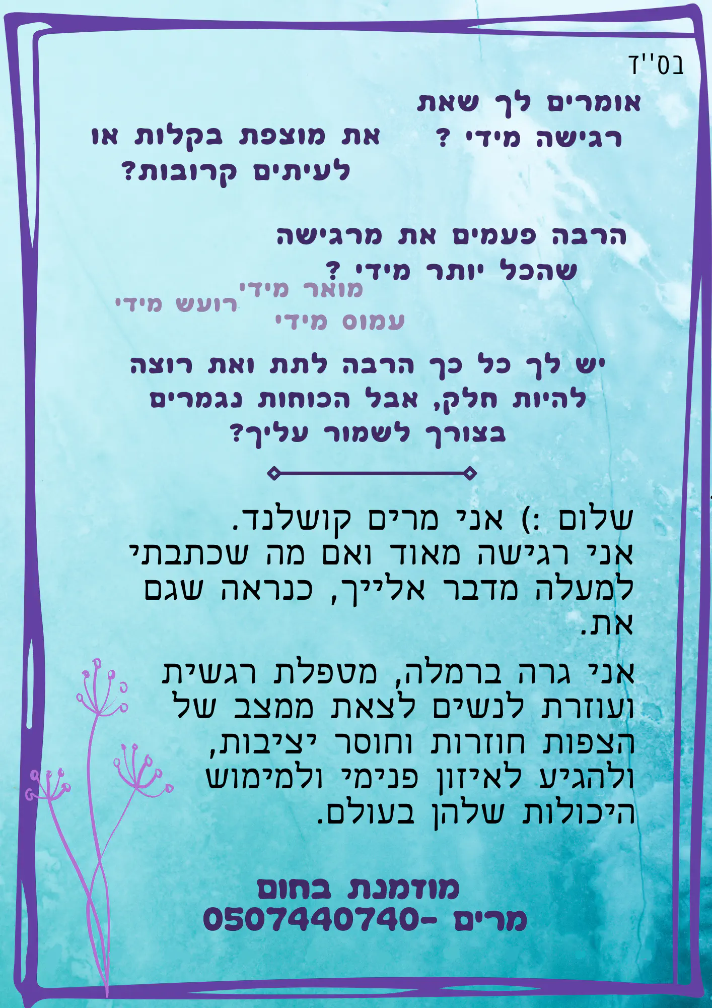רציתי לשתף אתכם שכבר תקופה ב''ה אני מכוונת את הקיניקה לנשים רגישות מאוד, וב''ה זוכה גם לעשות טוב ולעזור.