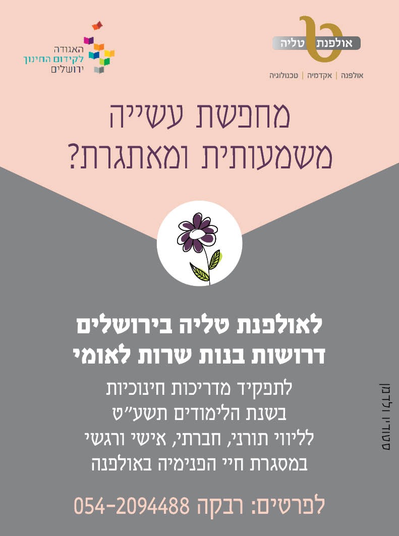 באולפנת פסגת זאב בירושלים מחפשים עוד שתי מדריכותה.ז.