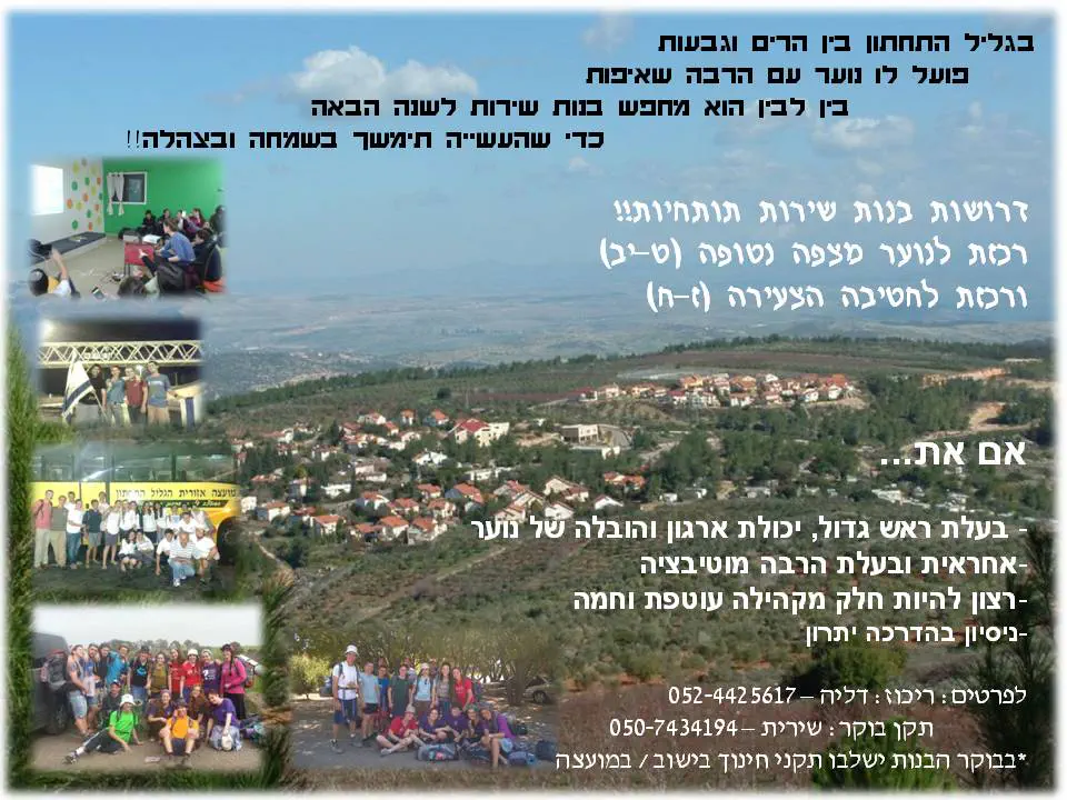 דרושה לנו רכזת נוער לנוער מקסים ביישוב מצפה נטופה, מגורים בדירת שירות ביישוב, תקן בוקר - מספר אפשרויות (גן ילדים, בית ספר)