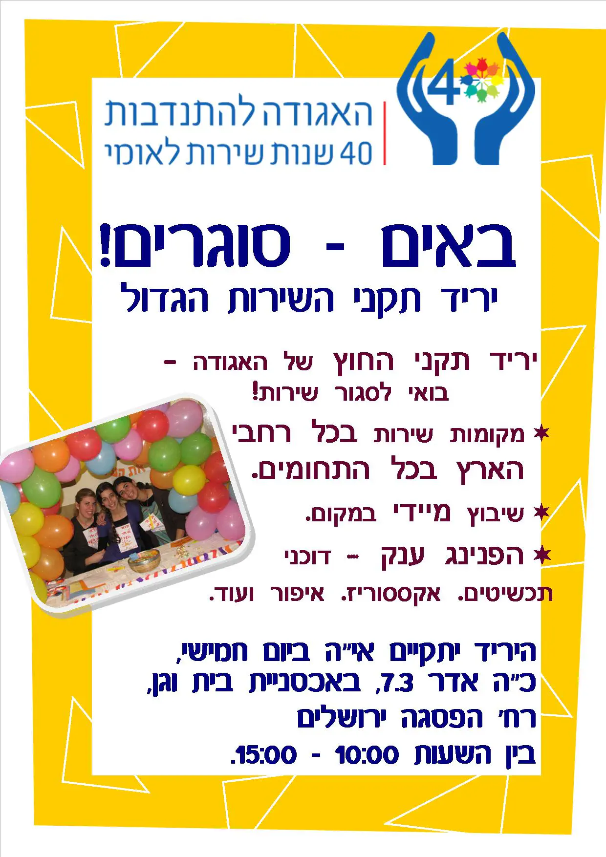לפני כחודש בערך סגרתי שירות לאומי בירושלים בתקן של האגודה להתנדבות (לשמחתי עדיין לא נרשם על שמי שיבוץ באגודה לתקן הזה)