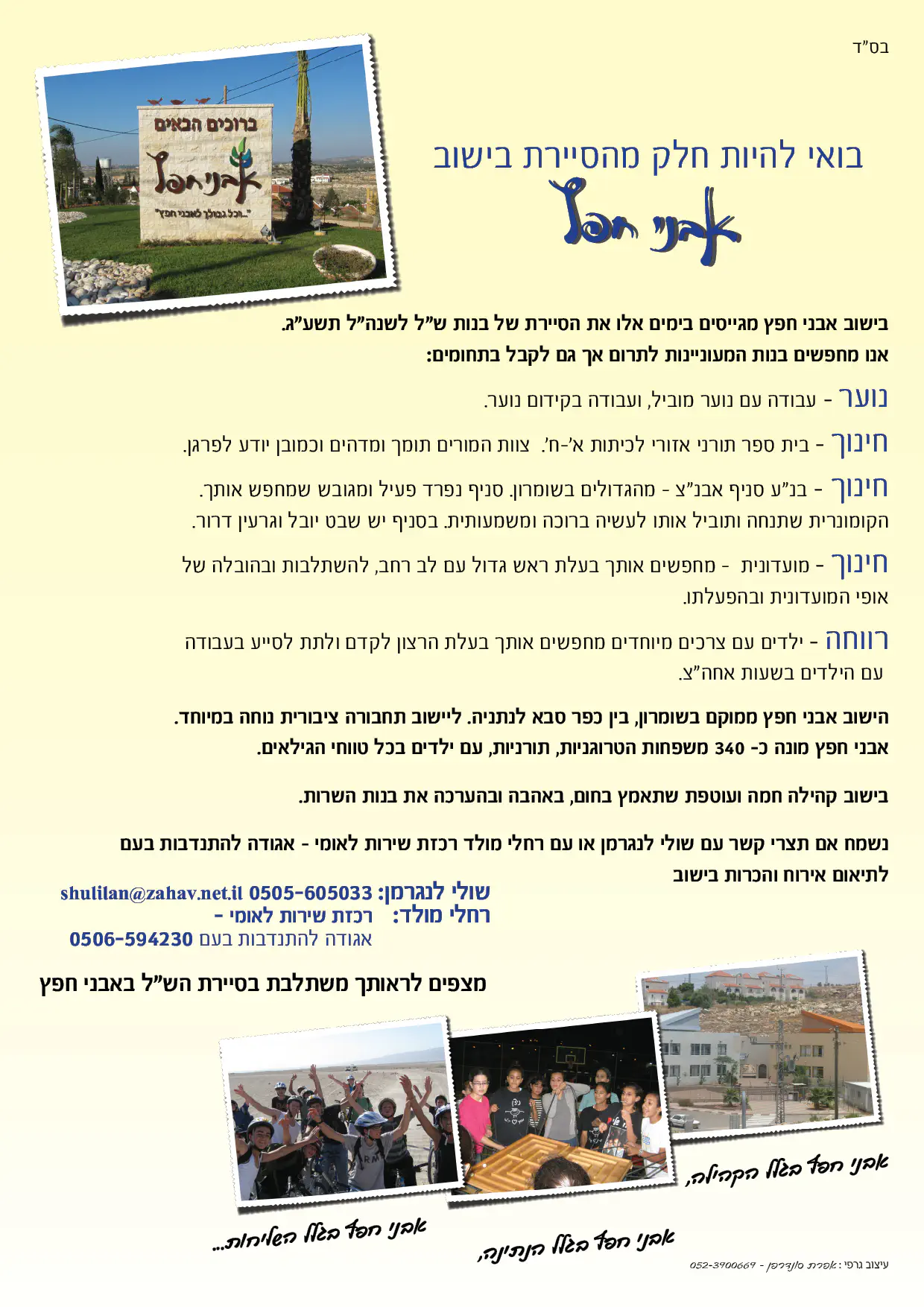 מחפשות שרות משמעותי? אבני חפץ היא המקום בשבילכם. בימים אלו אנו מגבשים את קבוצת בנות שרות לאומי לשנה"ל תשעג. שירות כקומונרית, עבודה עם נוער, חינוך רווחה ועוד תפקידים משמעותיים בקהילה חמה ותומכת. מוזמנות ליצור עימי קשר .