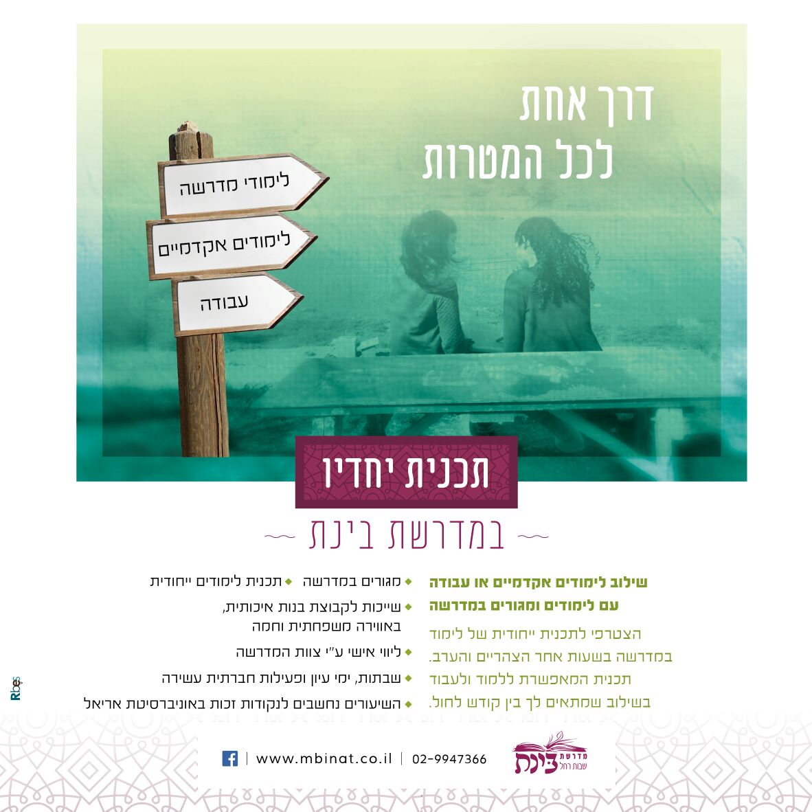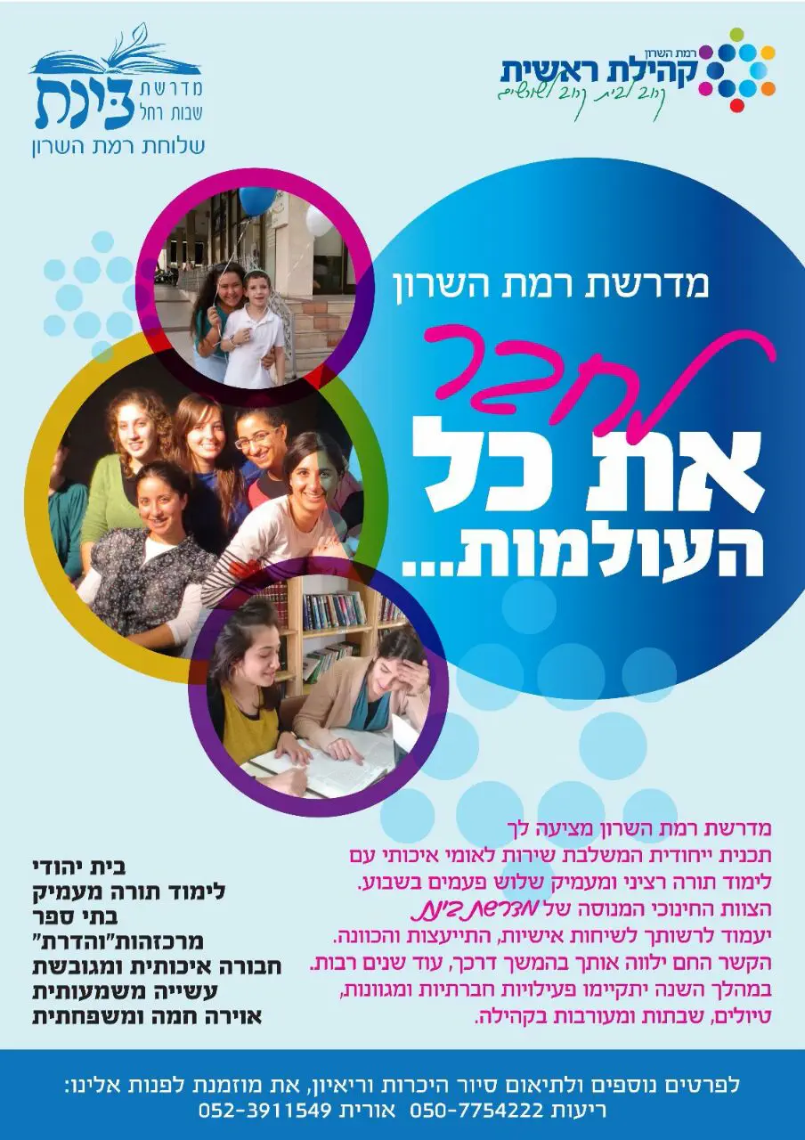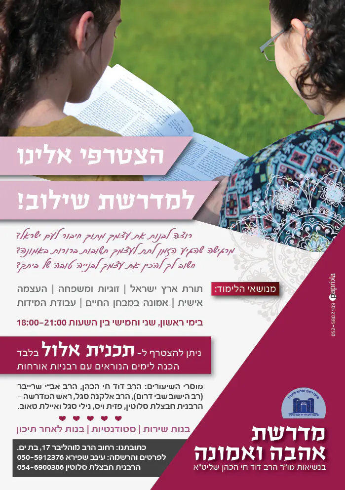 מדרשת שילוב במרכז, מדרשת שילוב לסטודנטיות, בנות שירות וכל החפצה, מדרשה לחיים, לימוד תורה לשמה בשמחה ואוירה נעימה וטובה.