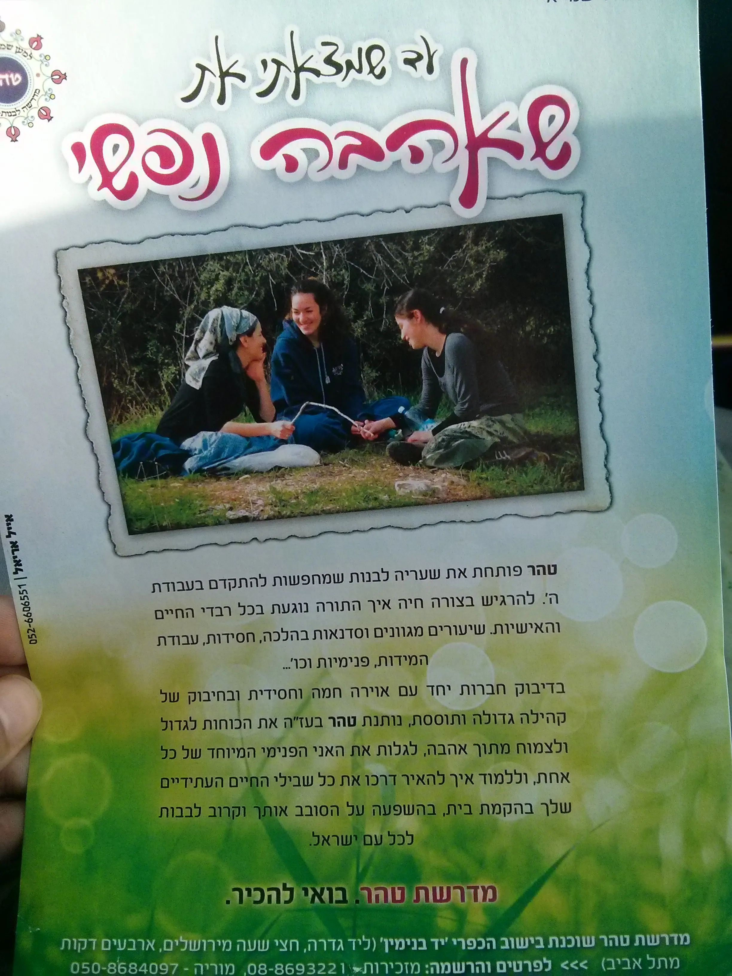 תרגישו חופשי לפנות אליי במהלך השבוע הקרוב בכל עת ושעה במהלך היום=] אז להזכירכן אנחנו נמצאים ביישוב יד בנימין- מדרשת טהר לבעלות תשובה. מחכה לשמוע מכן בקרוב בע״ה. הודיה- 0528109736 מירית 0506937853