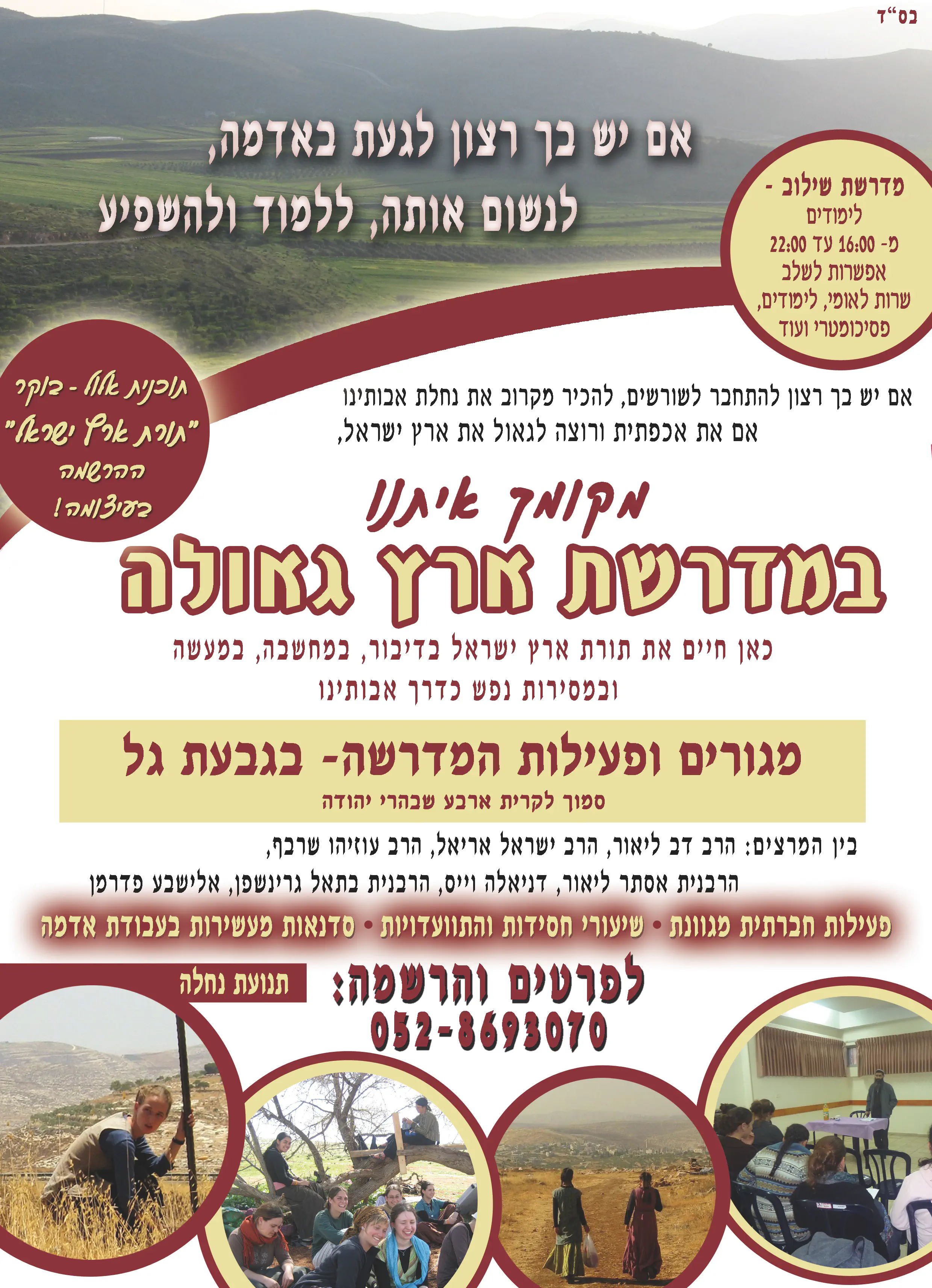 מדרשת "ארץ גאולה" פותחת בקרוב ממש את שעריה!!! המדרשה, הדוגלת בחיבור לארץ ולאדמה ממוקמת ב"גבעת גל" שבקריית ארבע.
