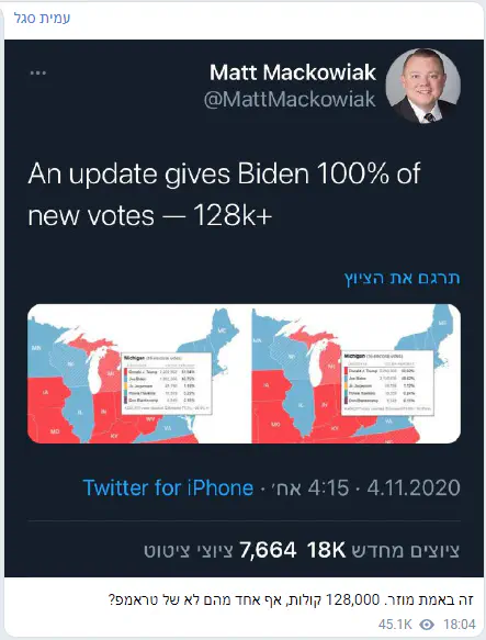 דבר נוסף שצריך לזכור, זה שאם ניקח את ויסקונסין כדוגמה, ההפרש שם הוא מאוד מאוד קטן בין ביידן לטראמפ וככול שההפרש יותר קטן ואם אפשרות להשפיע, טראמפ יגיע עם זה לבית המשפט ויטען לזיופים. לא יודע אם זה יצליח לו, אבל זה פרט שחושב לזכור.