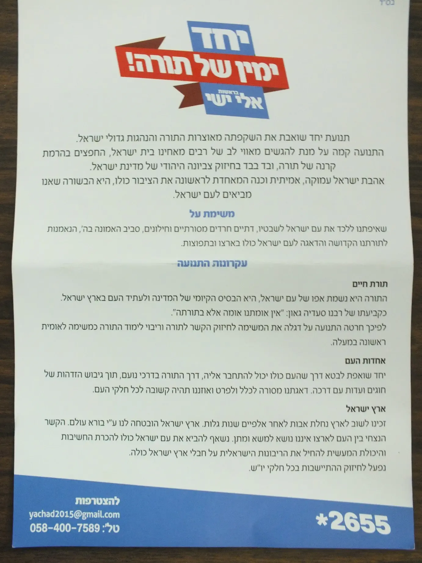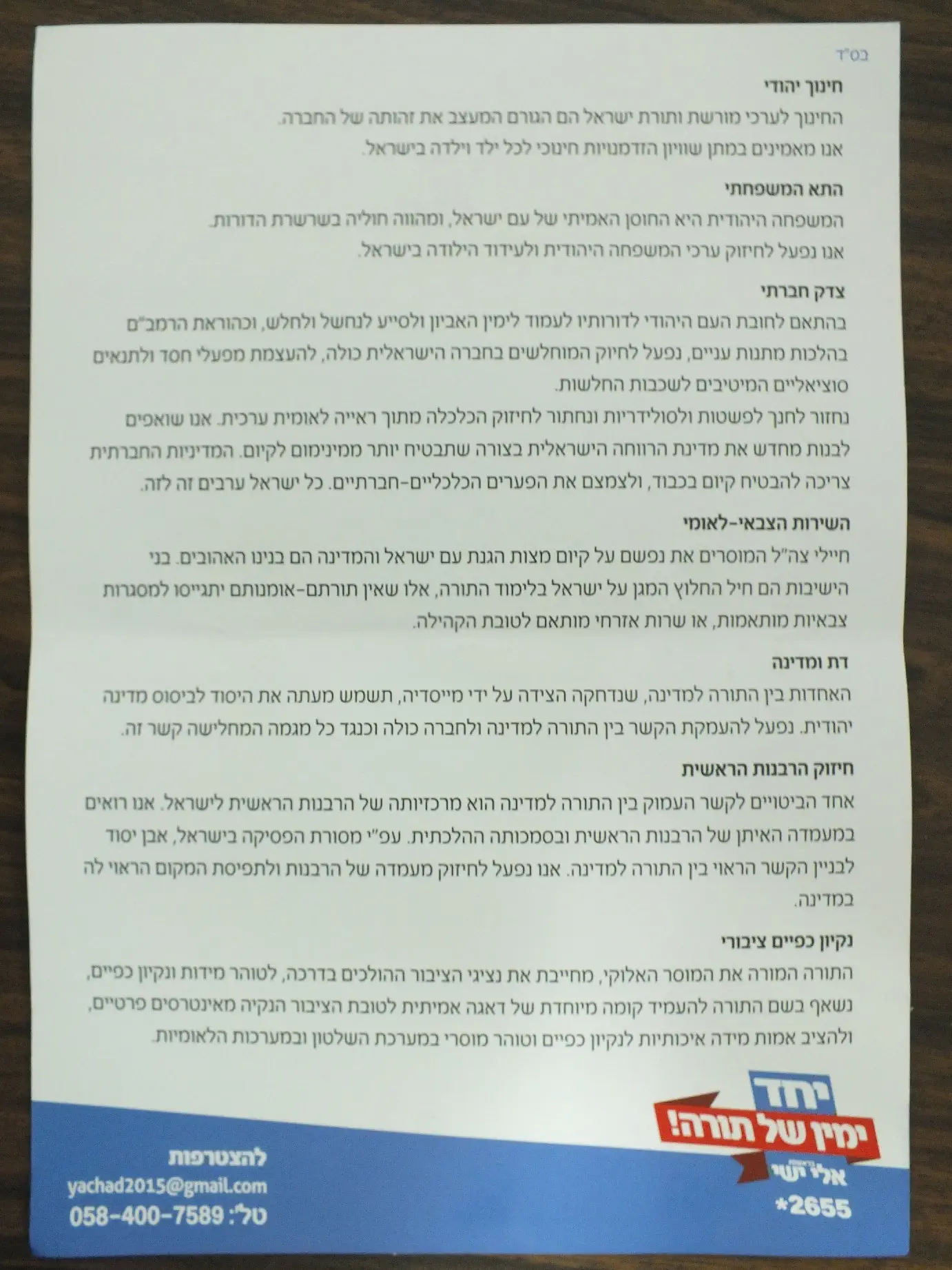 "הציבור הדתי לאומי מספיק פיקח וחכם כדי להבין את ההבדלים העצומים בינינו לבינם בתחומים המדיניים והתחומים הדתיים שזה אחד הנושאים החשובים ביותר. כשהדגל שלהם זה רות קלדרון שאוכלת לחם בפסח שלא יצפו שהציבור הדתי לאומי יילך איתם".
