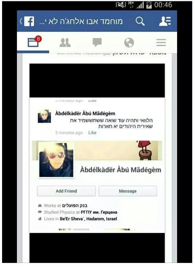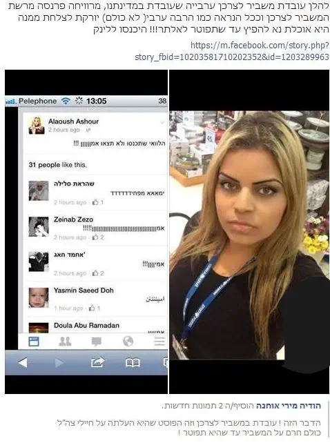 you: ברצוני גם לציין שתמונת הפרופיל שלה בפייסבוק הינה מחבל רעול פנים. לא נוכל לעמוד בכך.