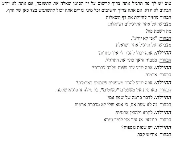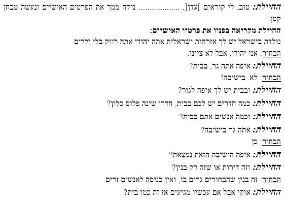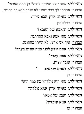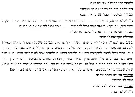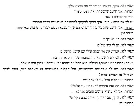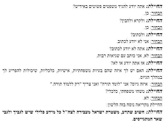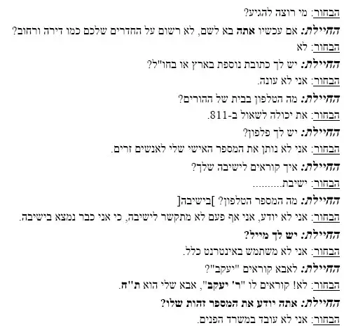גם היא מספרת על צעירים חרדים שמסרבים להגיש לה את תעודת הזהות שלהם אלא מעדיפים לזרוק אותה על ספסל סמוך כדי לא ליצור מגע. "כשאני שואלת שאלות הם עונים בקצרה ובשקט, כביכול כדי לצמצם למינימום את שיתוף הפעולה. במבחנים הממוחשבים יש רבים שפשוט לוחצים ENTER ושוב ENTER כדי לא לענות על אף שאלה", היא אומרת ומוסיפה: "היה לי אפילו מקרה שבו חייל אחד הסכים לדבר איתי רק ביידיש, ומאחר שלא היה לנו מתורגמן, שלחנו אותו הביתה.