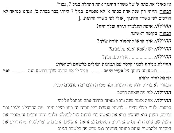 צעיר אחר הגדיר את התהליך ככפייה חילונית. "לדבר עם חיילת נראה לי פתאום כמו עולם אחר. גם הן ידעו שאין סיכוי שבאמת נתגייס, אז למה היה צריך את בזבוז הזמן הזה?", הוא אומר. "אין לאף אחד מאיתנו כוונה לפגוע בנשים, וזו האמונה שלנו ביום יום, לא לבוא איתן במגע. כמו שאתם החילונים נגד כפייה דתית, אין סיבה שתהיה פה כפייה חילונית, למה שתאבחן אותי חיילת ולא חייל?.