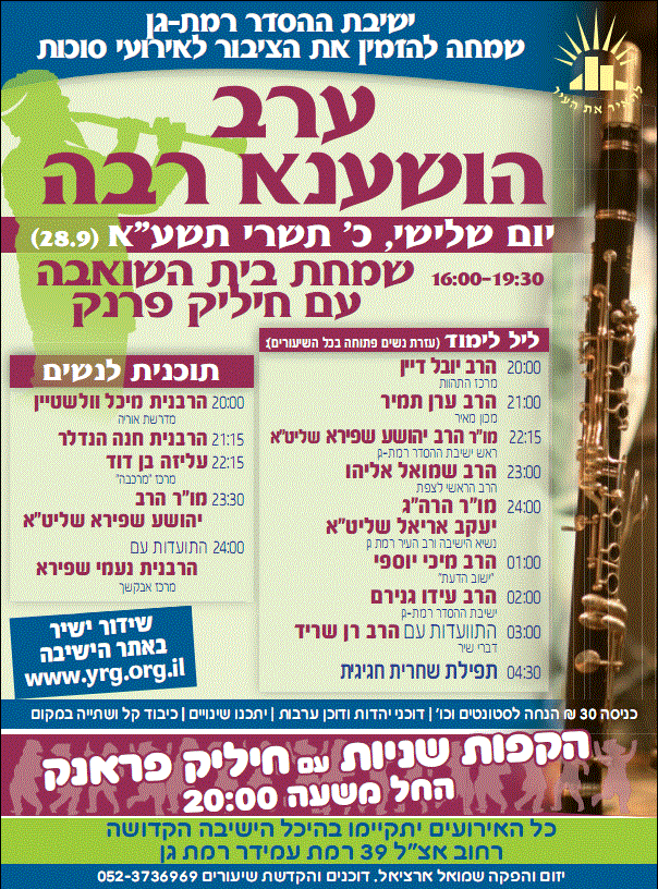 הזמנה לנשים וגברים לליל לימוד (הושענה רבה) מיוחד ביום ג' הקרוב, בישיבת רמת גן (האצ"ל 39).(מצורפת מודעה) בין הרבנים : הרב יובל דיין, הרב שמואל אליהו, הרב ערן טמיר, הרב מיכי יוספי, הרבנית נעמי שפירה , עליזה בן דוד ועוד.. כמו כן בשעות הצהריים תתקיים הופעה והרקדה של הקלרינט חיליק פרנק. במקום סוכות כשרות עם כיבוד קל לאורך הלילה . נא העבירו הלאה לחבריכם.