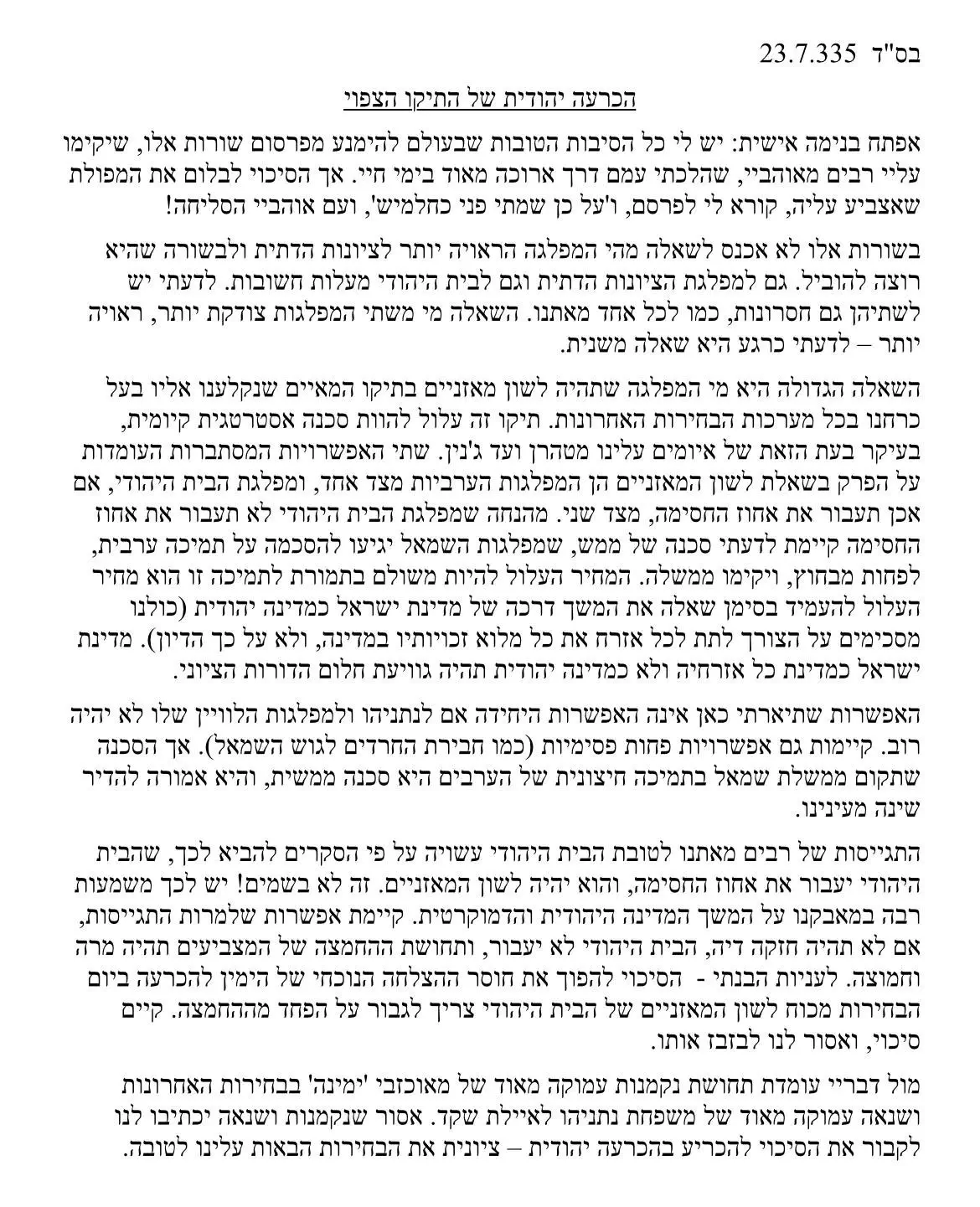 יש לי ידיד תושב גוש עציון שהצביע לננץ משום שהציונות הדתית התחייבה ללכת עם נתניהו, שאינו ראוי לדבריו להיות ראש ממשלה. אודה ולא אבוש, בעיני הוא ראוי להערכה, כי פיו וליבו שווים.